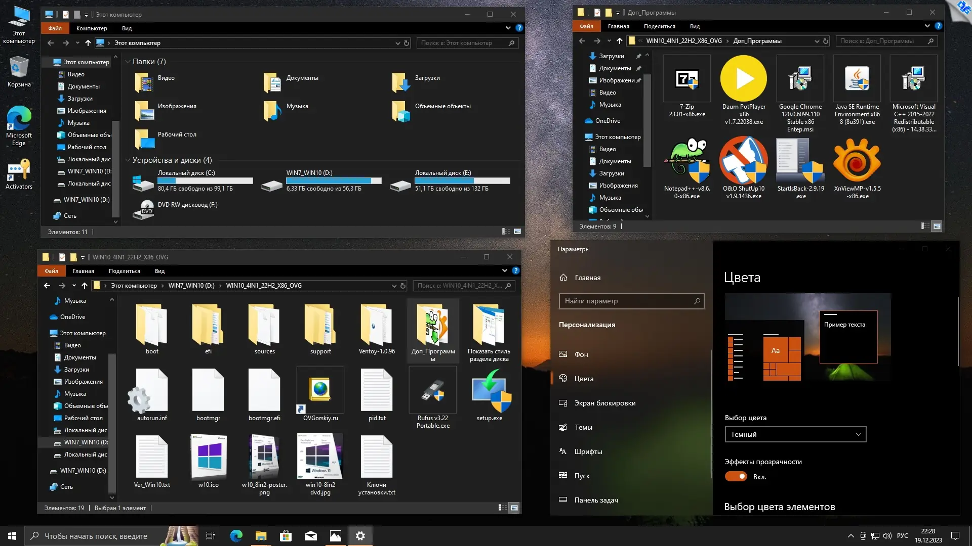 Обновлённые оригинальные русские образы операционной системы Windows 10 от Microsoft, объединённые в два универсальных ISO-файла (x86 и x64), включают в себя актуальные редакции Pro, Home и Enterprise с интегрированными обновлениями по декабрь 2023 года. Сборка основана на официальных образах MSDN и предназначена для пользователей, которым нужна почти «чистая» система без лишних модификаций, но с возможностью восстановления и диагностики через встроенные инструменты. Установка поддерживает как традиционный режим MBR, так и современный UEFI с дисками GPT, обеспечивая совместимость с широким спектром оборудования.