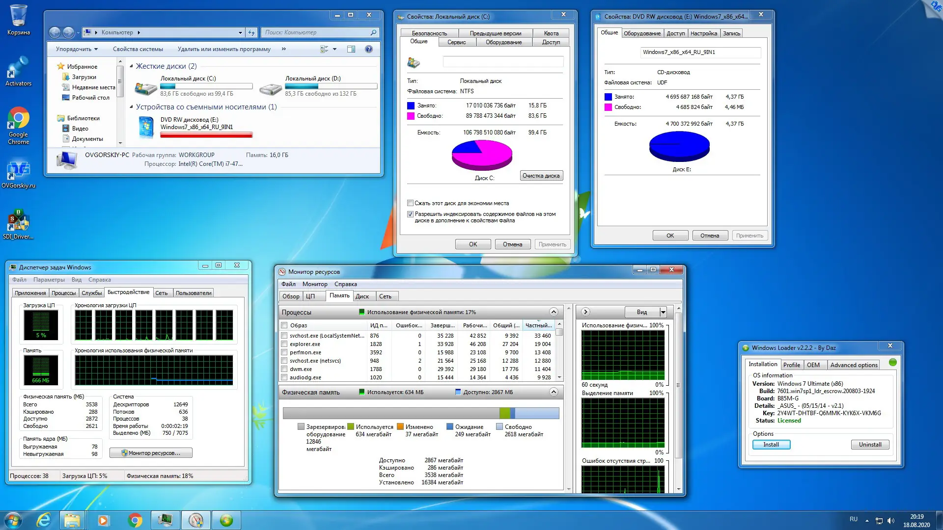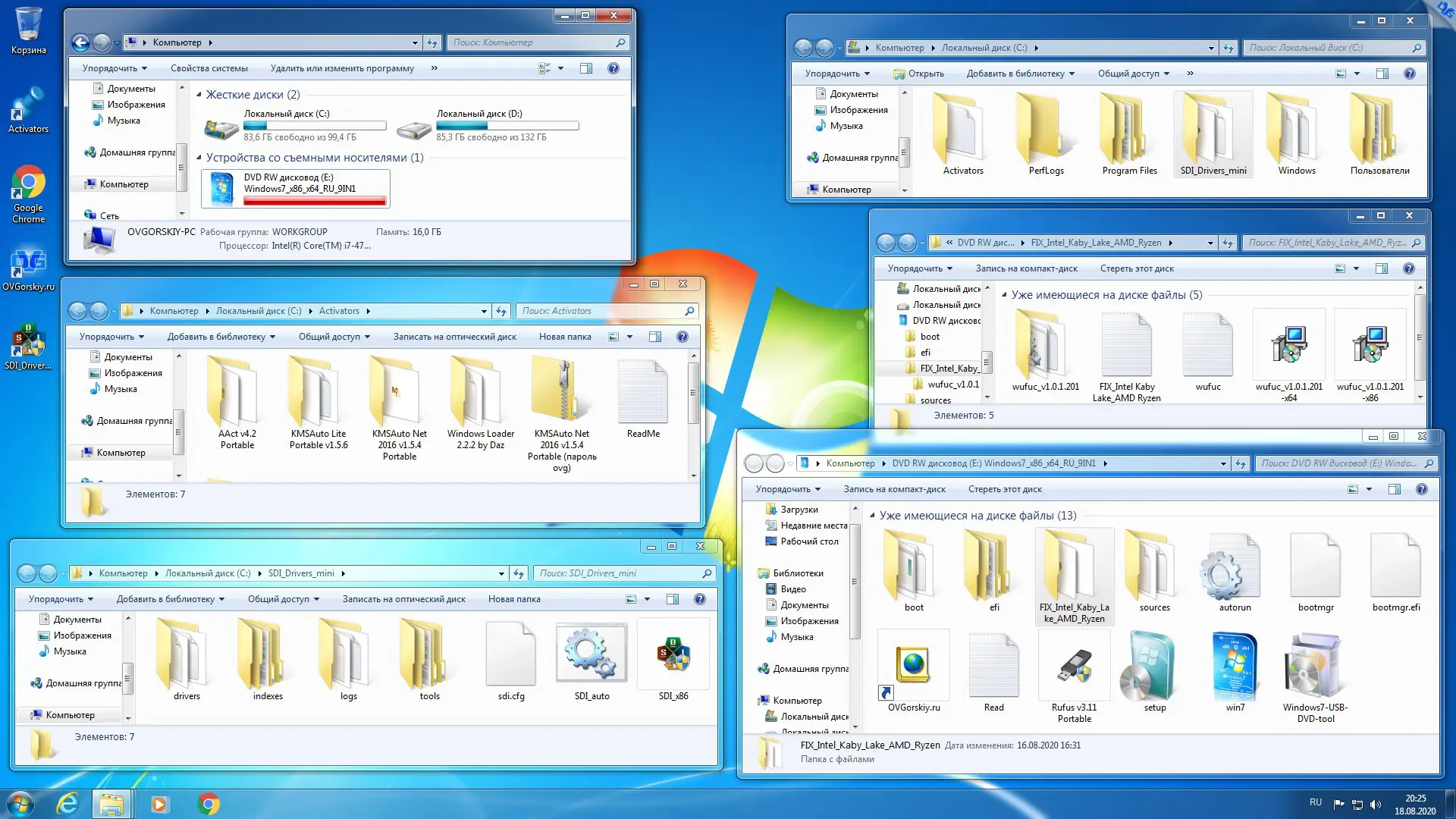 После записи образа на DVD или флешку, компьютер загружается с носителя, и запускается установщик. Пользователь выбирает, из какого загрузчика — 32-битного или 64-битного — будет происходить установка. Из 32-битного варианта можно устанавливать любые редакции на MBR-диски, а 64-битный автоматически активируется при установке на GPT через UEFI. Далее выбирается нужная редакция Windows 7, целевой диск и тип разметки. Процесс установки занимает от 30 до 60 минут, в зависимости от аппаратной конфигурации. После установки автоматически интегрируются Google Chrome, Adobe Flash Player, драйвера и .NET Framework. Для первоначальной настройки доступна утилита SDI для установки базовых драйверов. Телеметрия отключена на уровне реестра и планировщика задач, что обеспечивает приватность.