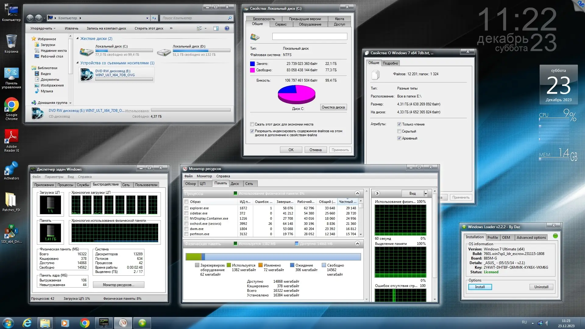 Для установки системы рекомендуется использовать записанный DVD-диск либо загрузочную флешку, созданную с помощью Rufus или Windows7-USB-DVD-Tool. При создании носителя важно отключить антивирус, чтобы избежать удаления компонентов активации. Установка производится из под начальной загрузки компьютера, с выбором чистого раздела для форматирования. После начала установки процесс может занять от 15 до 60 минут из-за интегрированных обновлений и программ. При первой загрузке в системе уже будут установлены все необходимые компоненты, включая визуальное оформление, драйверы и утилиты. Для активации можно использовать лицензионный ключ или встроенные инструменты, в зависимости от типа диска — MBR или GPT. На рабочем столе появятся ярлыки для установки драйверов, активации и настройки системы.