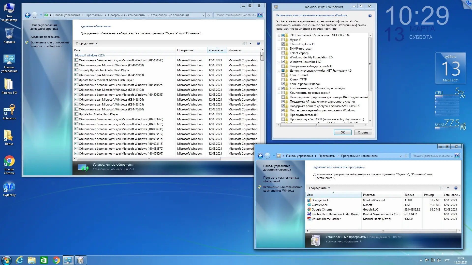 - Включены гаджеты рабочего стола через 8GadgetPack и поддержка сторонних тем через Ultra UXTheme Patcher.