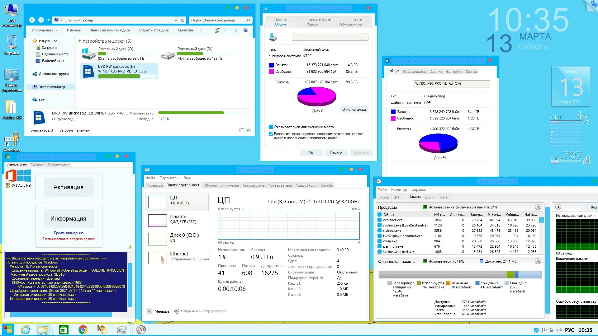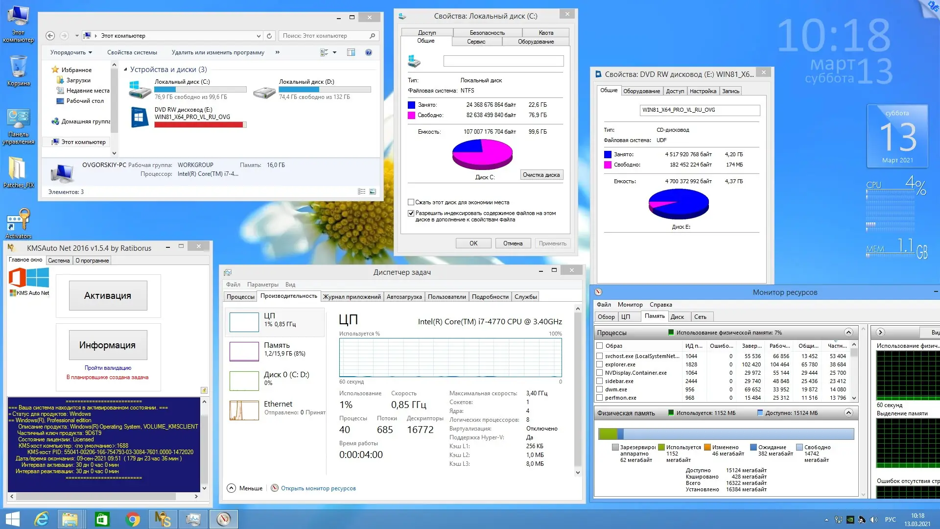 - Система оптимизирована: удалены лишние метроприложения, отключена гибернация, настроен файл подкачки.