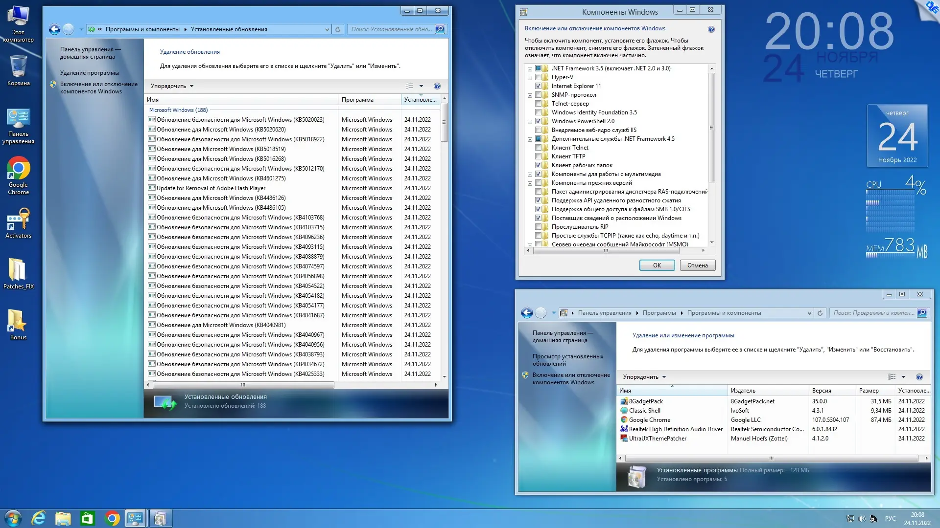 - Включены утилиты для возврата меню «Пуск» и установки гаджетов на рабочий стол.