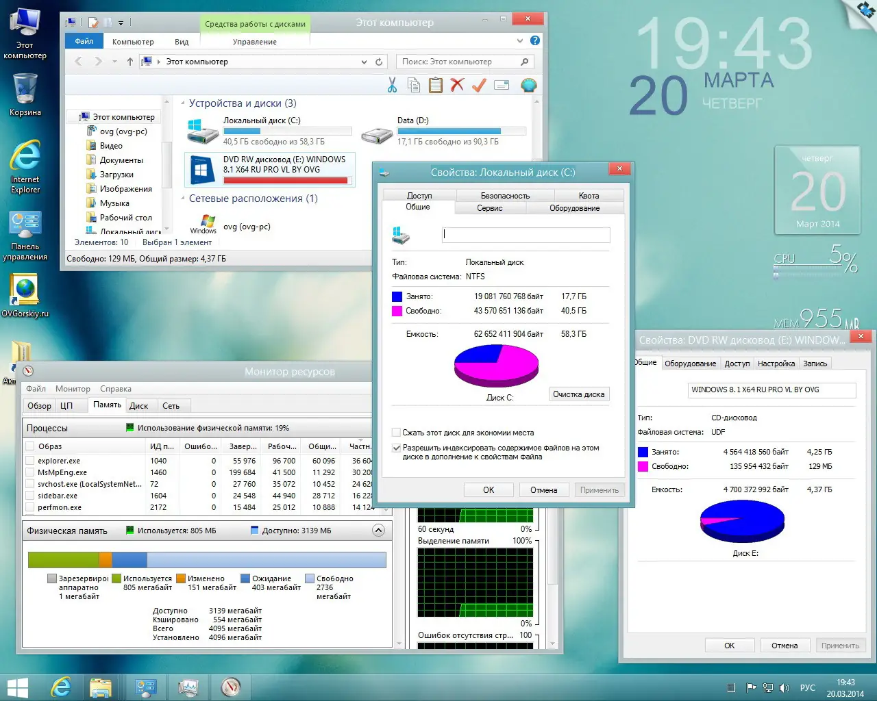 Процесс установки ничем не отличается от оригинальной процедуры Microsoft, однако включает дополнительные этапы автоматической интеграции софта. После выбора языка и типа установки система копирует файлы, перезагружается и продолжает развёртывание. На этапе post-install запускаются встроенные установщики: Classic Shell возвращает меню «Пуск», 8GadgetPack добавляет поддержку гаджетов, а Ultra UXTheme Patcher позволяет использовать неофициальные темы оформления. Пользователь может настроить отображение элементов — например, показывать «Мой компьютер» на рабочем столе или расширения файлов. Также активируется встроенный просмотрщик PDF и веб-камера. После завершения установки на системном диске появляются папки с дополнительным контентом, включая альтернативные иконки, темы и офисный пакет MS Office 2013 в виде репака.
