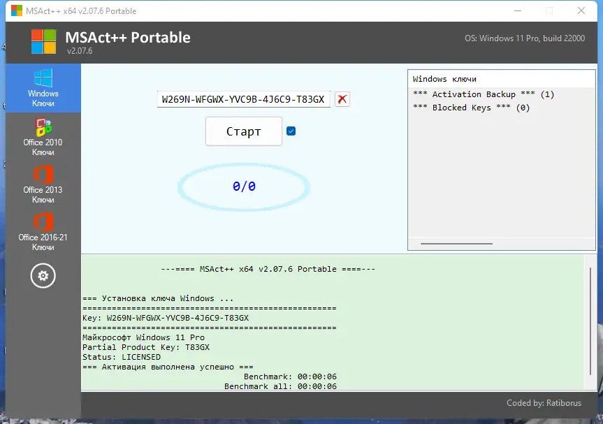 Для начала работы необходимо выбрать тип продукта — Windows или Office, затем ввести действительный ключ в соответствующее поле. После нажатия кнопки «Старт» начинается процесс активации. Если ключ поддерживает онлайн-активацию, система сама свяжется с серверами Microsoft и завершит процедуру. В случае, когда интернет-активация невозможна, но ключ не заблокирован, открывается окно для телефонной активации. Пользователю необходимо позвонить в Центр активации, сообщить коды из полей «1-9», после чего оператор продиктует ответный код. Его требуется ввести в поля «A-H» и подтвердить нажатием «Применить». При точном вводе продукт будет активирован. Для ускорения процесса можно использовать горячие клавиши: удерживая Ctrl, можно вставить ответный код из буфера обмена прямо в поле «A». Также удержание Ctrl при вводе ключа запускает принудительное создание резервной копии активации, что полезно при переустановке системы.