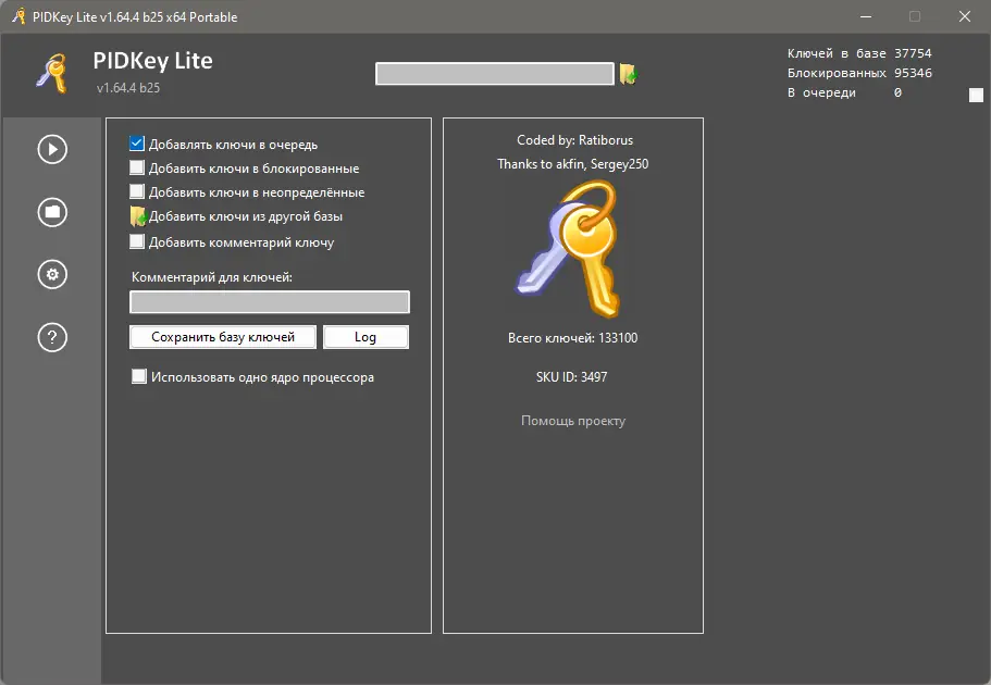 Для начала работы с программой достаточно запустить её из папки, не проходя этап установки. После первого запуска формируется база данных pkbase.db, в которой будут храниться все ключи. Пользователь может подключить внешнюю базу, указав путь к файлу напрямую в командной строке или через параметры запуска. Для обновления версии программы рекомендуется скопировать существующую базу в новую папку и выполнить проверку и восстановление структуры базы через комбинацию клавиш Ctrl+R. Также доступна команда /unpack, которая извлекает вспомогательные файлы, такие как xrm-ms, рядом с исполняемым файлом, что может потребоваться для диагностики лицензий. При необходимости можно использовать сторонние базы, включая добавление заблокированных или неопределённых ключей из новой версии программы.
