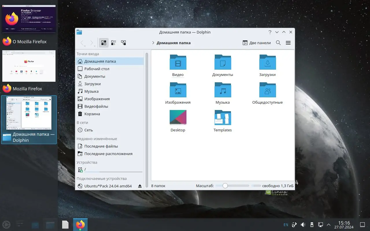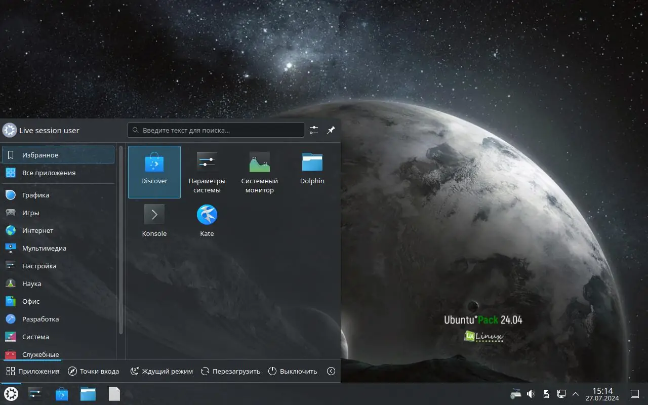 Ubuntu — это дистрибутив Linux, ориентированный на домашнее и офисное использование, разработанный по принципу «установил и забыл». Он построен на базе Ubuntu 24.04 LTS и предлагает готовое к работе окружение с предустановленными приложениями, поддержкой мультимедиа, офисными инструментами и средствами безопасности. Интерфейс KDE обеспечивает привычный внешний вид, схожий со средой Windows, что упрощает переход для пользователей, ранее работавших в других операционных системах.