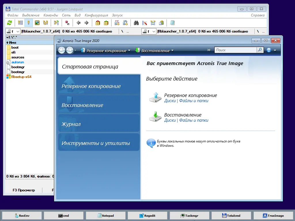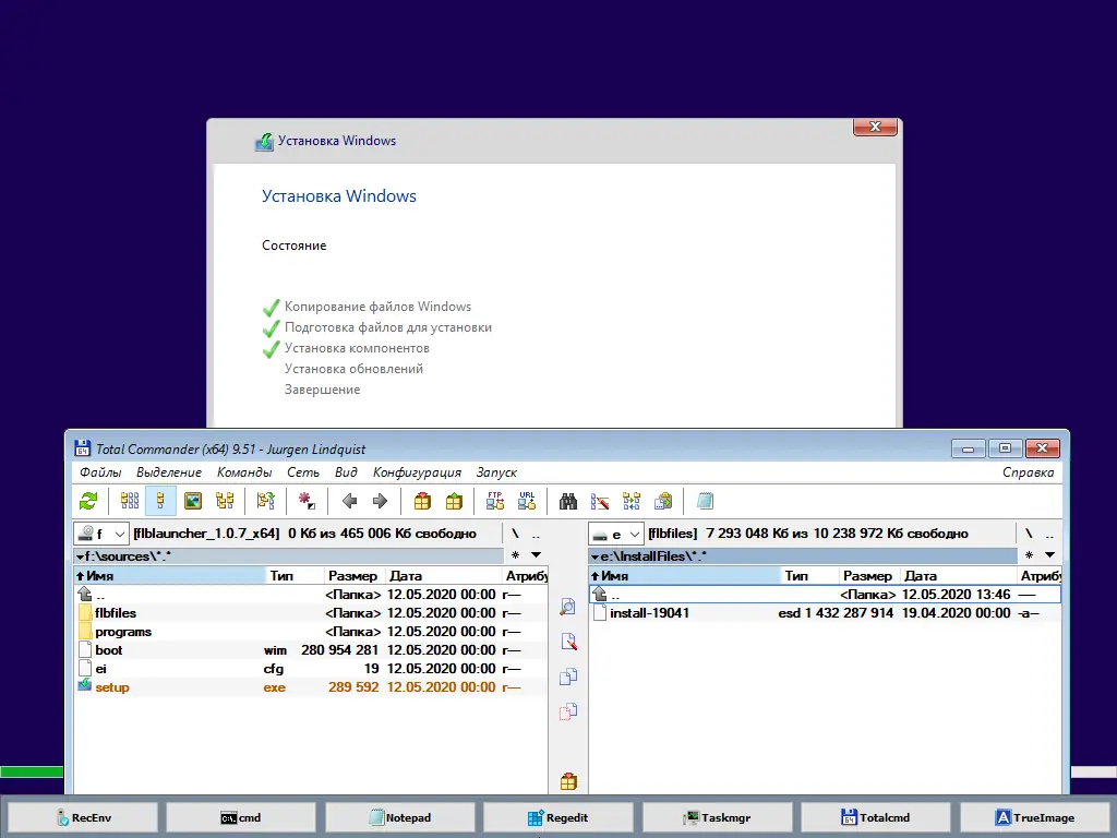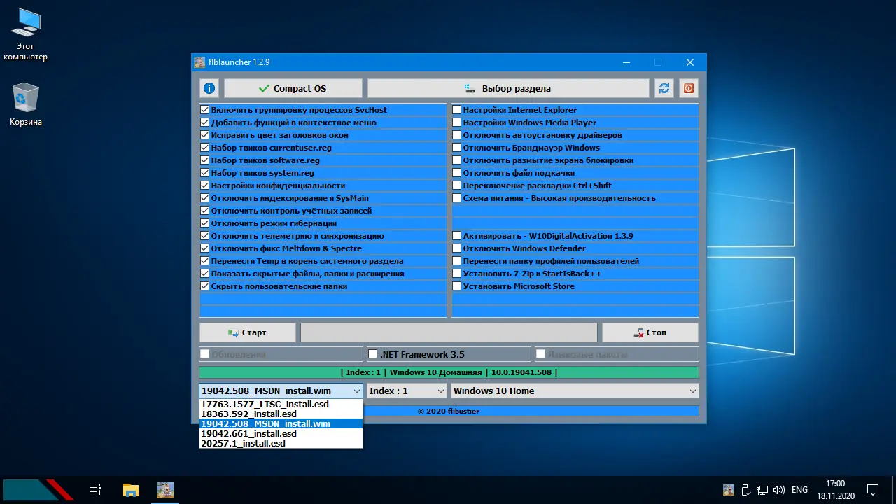 Установка осуществляется как с флешки, так и из-под работающей Windows 10, что расширяет возможности развёртывания. Лаунчер flblauncher автоматически обрабатывает этапы установки: выбор языка, принятие лицензий, подключение дополнительных пакетов. Пользователь может добавлять свои wim- или esd-образы, размещая их в указанной папке с соответствующим именем. Через конфигурационный файл flblauncher.ini настраиваются чекбоксы с твиками, кнопки с утилитами, цветовые схемы и шрифты. Программы вроде Acronis True Image или Total Commander доступны прямо из среды установки, что удобно при работе с дисками. После установки система готова к использованию — все настройки, включая отключение телеметрии, сбора данных и SmartScreen, применяются автоматически.