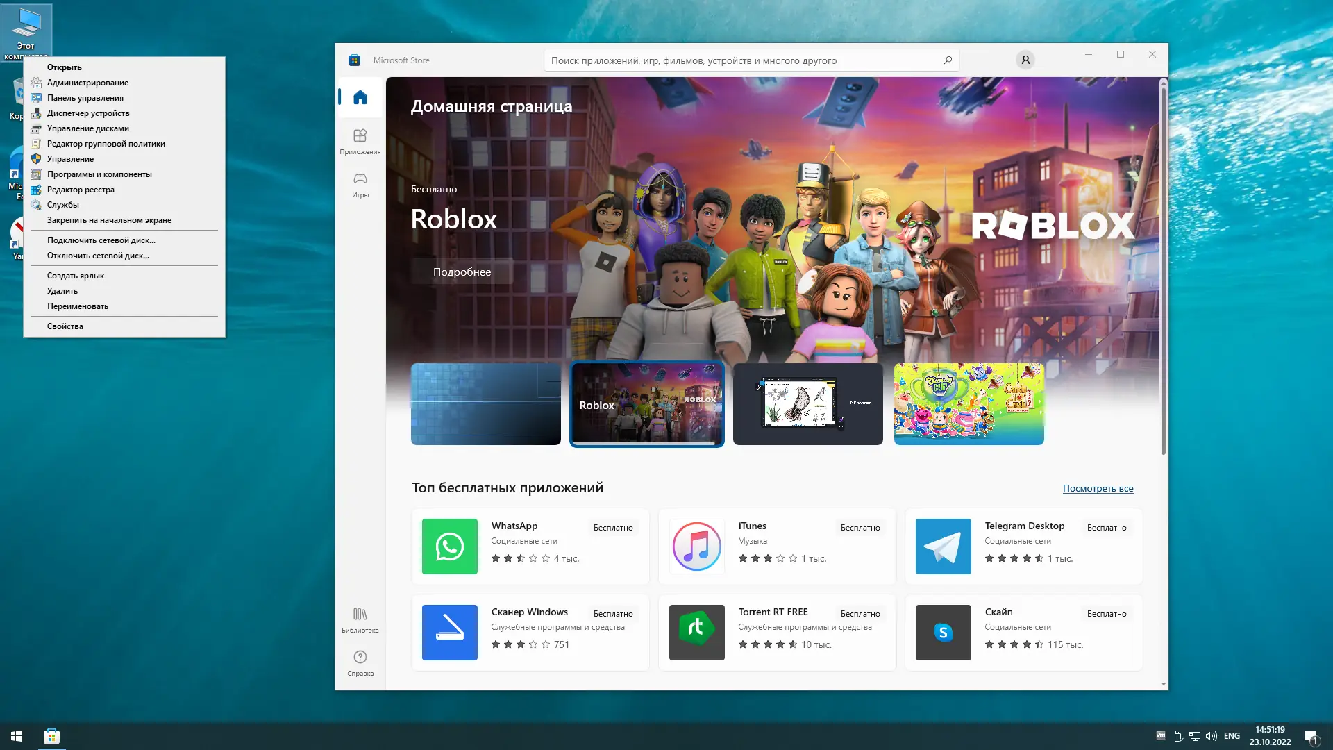 - Удобное администрирование: в контекстное меню «Этот компьютер» добавлены ссылки на диспетчер устройств, реестр и настройку системы.