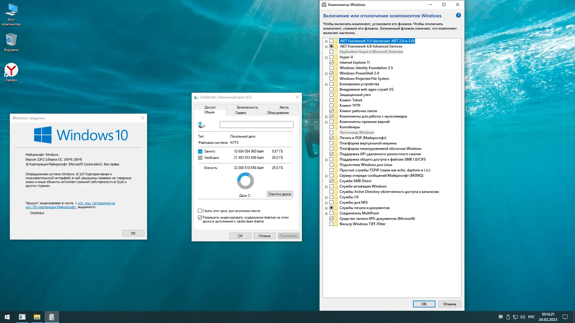 Операционная система собрана на базе лицензионных образов ru-ru_windows_10_business_editions_version_22h2 и ru-ru_windows_10_enterprise_ltsc_2021. Включены четыре редакции: Home, Pro, IoT Enterprise и Enterprise LTSC. Поиск функционирует корректно, хотя его значок скрыт в интерфейсе. Телеметрия полностью вырезана, что повышает приватность и безопасность. Управление защитником Windows осуществляется через отдельный переключатель в меню «Пуск», для применения изменений требуется перезагрузка. Работа с образом проводится с помощью утилиты DISM, что обеспечивает совместимость и надёжность при развёртывании.