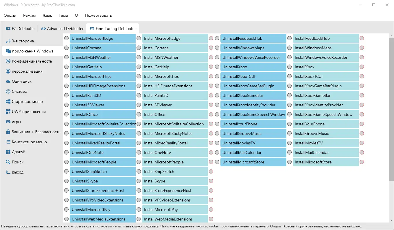 Debloater представляет собой графическое приложение, упрощающее взаимодействие с системными настройками через удобный интерфейс с вкладками. Оно основано на проверенных скриптах с github, разработанных сообществом энтузиастов, и не требует глубоких знаний командной строки. Утилита поддерживает широкий спектр функций, включая деинсталляцию предустановленного программного обеспечения и настройку параметров безопасности.