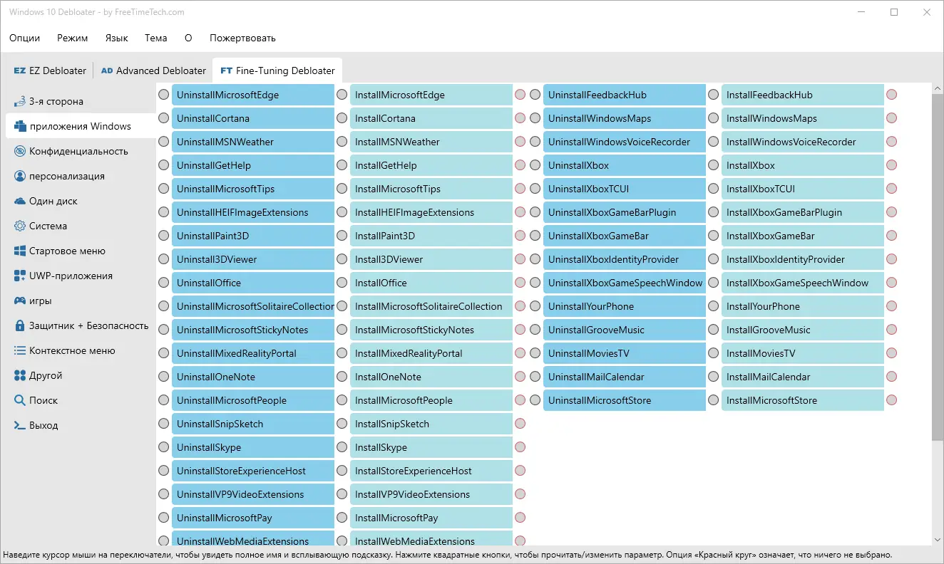 - Программа предоставляет доступ к управлению предустановленными приложениями, такими как Microsoft Edge, OneDrive, Cortana и другие.