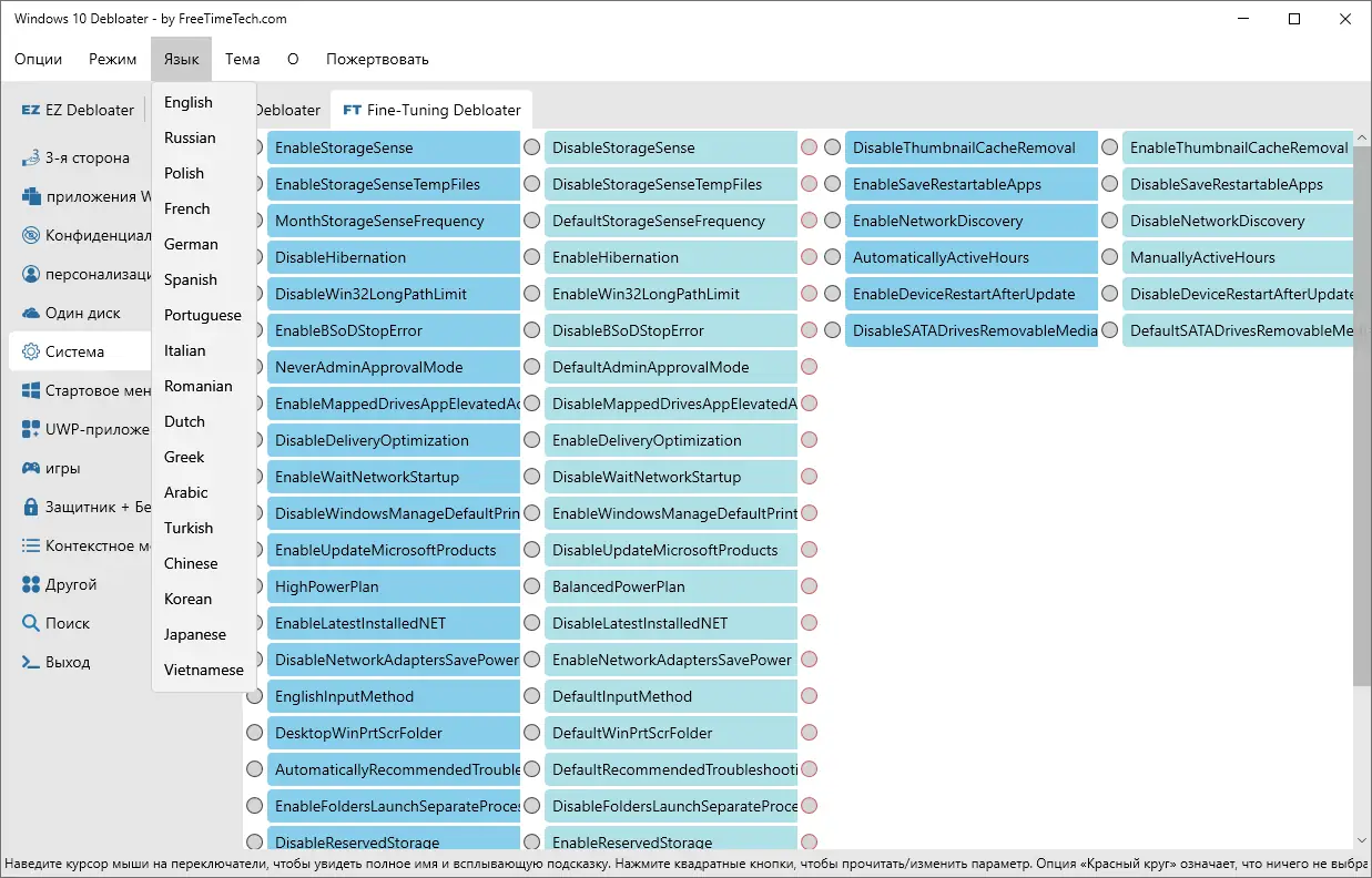 - Имеет вкладки для быстрого доступа к разным категориям настройки: EZ Debloater, Windows Apps, Privacy & Telemetry и другим.