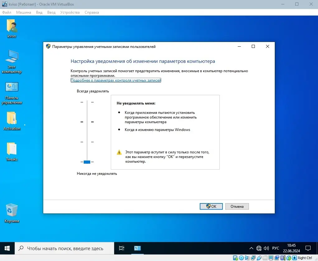 - Отключён UAC, что упрощает выполнение административных задач, а папка Backup очищена для освобождения места.