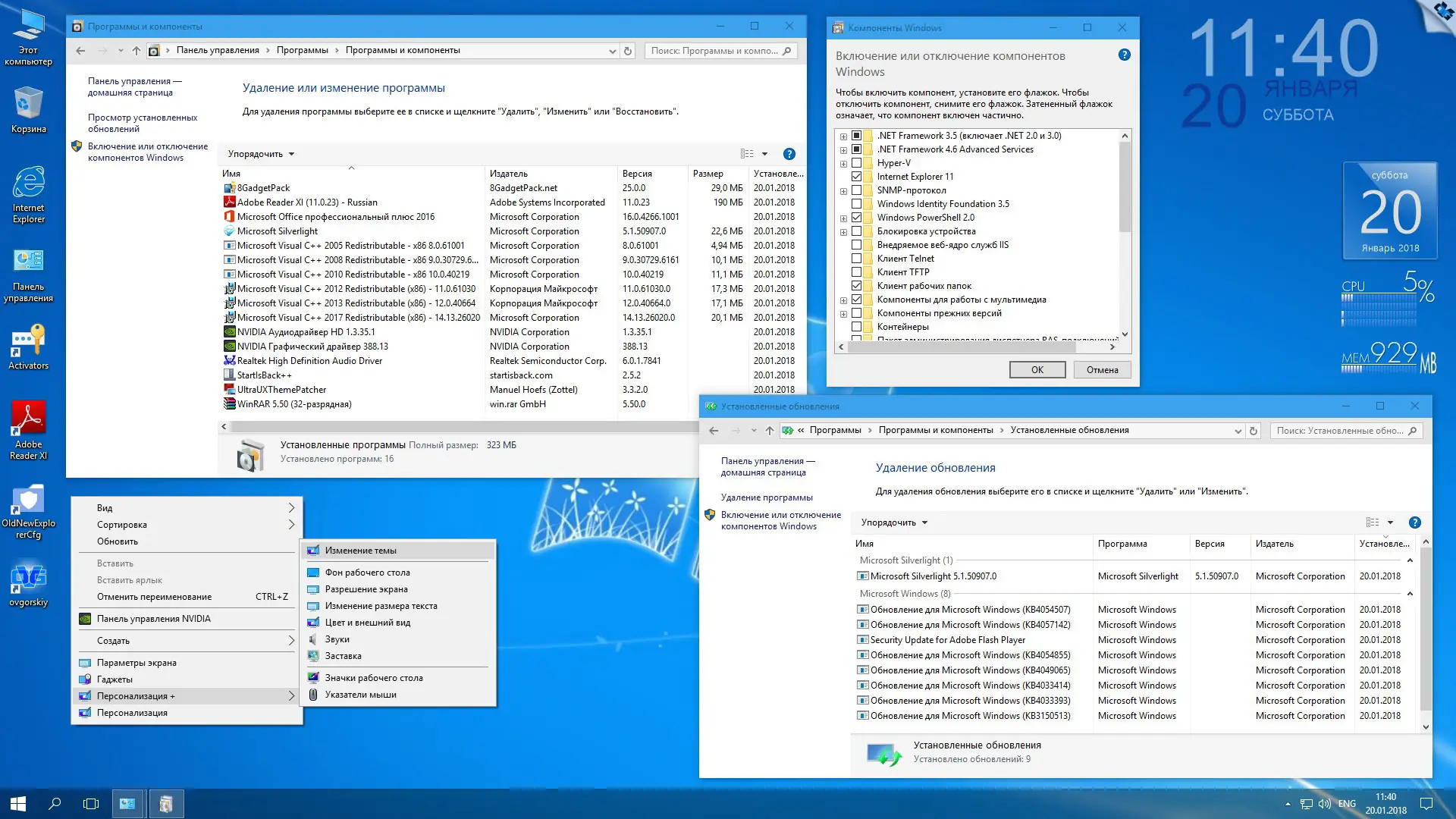 После установки система готова к использованию: все компоненты работают из коробки. Пользователь может сразу приступить к работе с документами, таблицами и презентациями через предустановленный Microsoft Office 2016. Для настройки внешнего вида рекомендуется использовать включённые темы и утилиту OldNewExplorer, которая улучшает отображение интерфейса. Гаджеты рабочего стола устанавливаются через 8GadgetPack, а возможность применения сторонних тем обеспечивается патчем UltraUXThemePatcher. Все изменения в системе можно настроить через меню «Персонализация+», доступное на рабочем столе. Управление обновлениями осуществляется вручную или с помощью включённой утилиты Windows Update MiniTool.