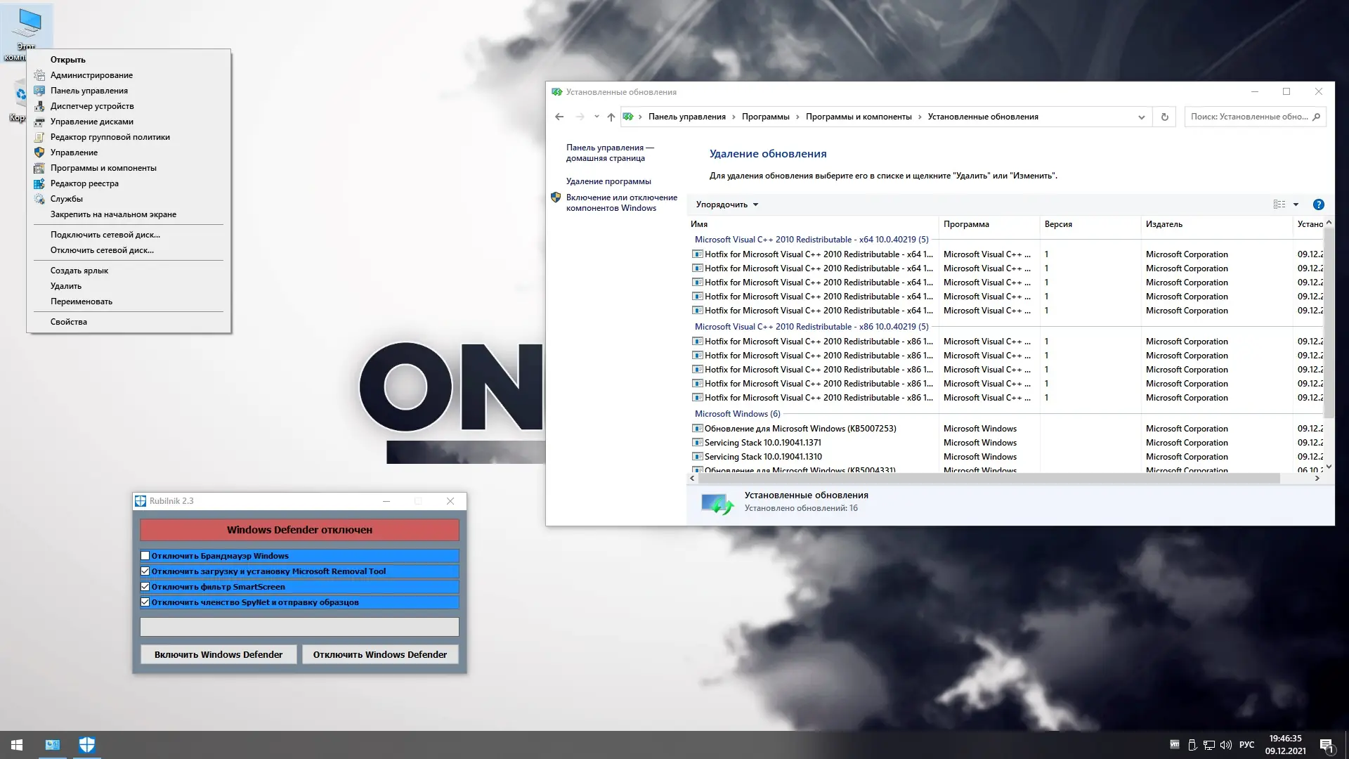 - Отключён Windows Defender по умолчанию с возможностью включения через контекстное меню Пуск