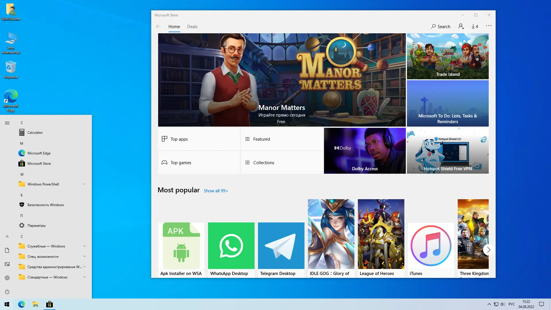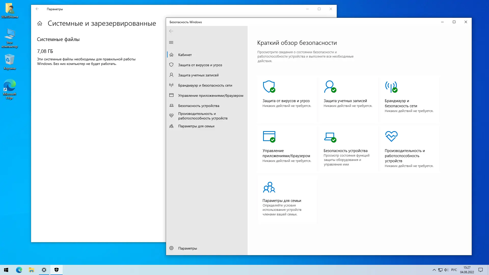 - Microsoft Defender работает как основной антивирус, а SmartScreen отключён для Edge и Store.