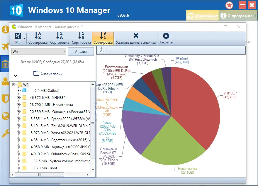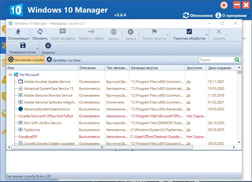 Работа с Windows 10 Manager