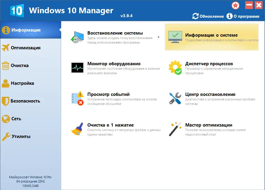 Windows 10 Manager — это комплексное решение для настройки, оптимизации и обслуживания операционной системы, объединяющее более сорока инструментов в едином интерфейсе. Программа помогает ускорить работу системы, очистить реестр, настроить автозагрузку, повысить безопасность и персонализировать внешний вид Windows 10 под индивидуальные предпочтения пользователя.