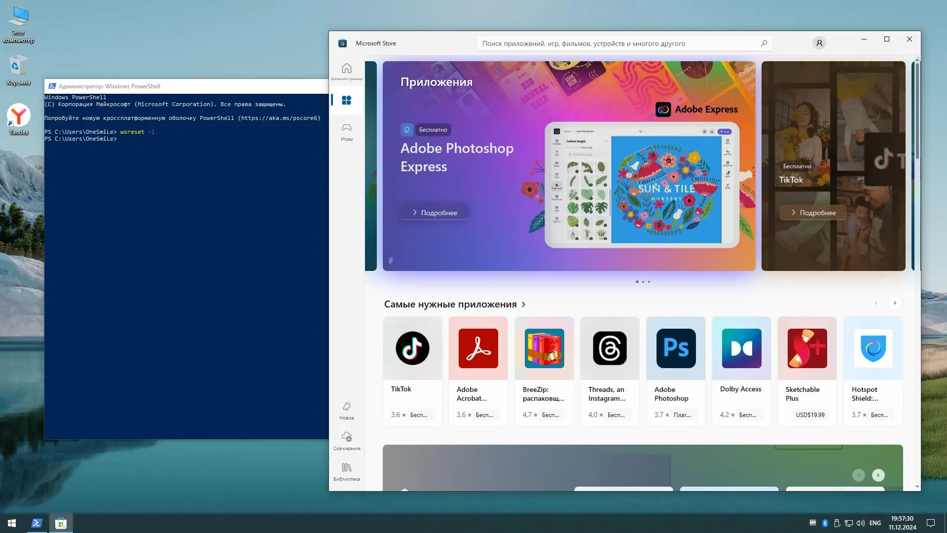 После установки система готова к работе, но содержит несколько специфических особенностей, требующих краткого ознакомления. Защитник Windows отключён по умолчанию, но его можно активировать через отдельное приложение Defender Switch, доступное в меню «Пуск» — для вступления изменений в силу требуется перезагрузка. Для установки Магазина приложений необходимо запустить команду wsreset -i в PowerShell с правами администратора при наличии интернет-подключения. После установки Магазина становится доступна загрузка дополнительных приложений, включая Xbox и Game Bar. Все изменения в контекстном меню активируются при удержании клавиши Shift, что позволяет быстро устанавливать CAB-пакеты или извлекать содержимое MSI-файлов. Работа с системой осуществляется стандартными средствами, включая утилиту DISM для обслуживания образа и восстановления компонентов.
