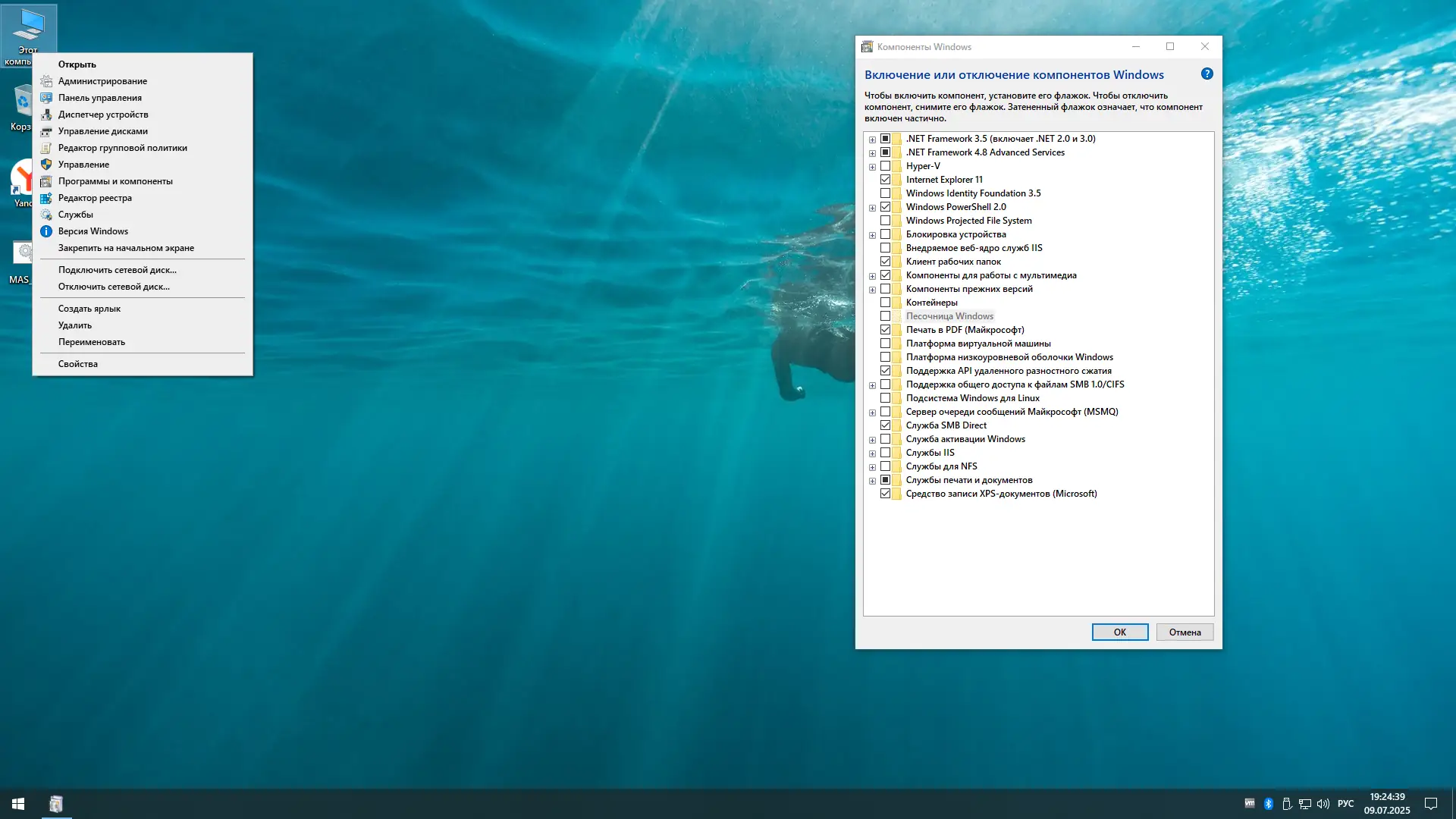 После установки пользователь получает чистую и быструю систему с классическим интерфейсом. Поиск в системе функционирует, но его значок скрыт для минимализма. Для просмотра изображений по умолчанию задействован классический Windows Photo Viewer. Шрифт интерфейса изменён на Segoe UI Semibold, что улучшает читаемость. Контекстное меню возвращено к привычному виду, а при зажатии клавиши SHIFT появляются дополнительные команды: установка .cab-пакетов и извлечение содержимого .msi-файлов. Управление системой упрощено — в контекстное меню «Этот компьютер» добавлены ссылки на диспетчер устройств, реестр и конфигурацию. Для установки Microsoft Store и Xbox используется команда wsreset -i в PowerShell с правами администратора при наличии интернета.