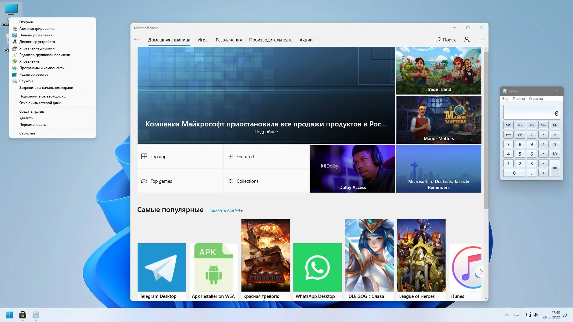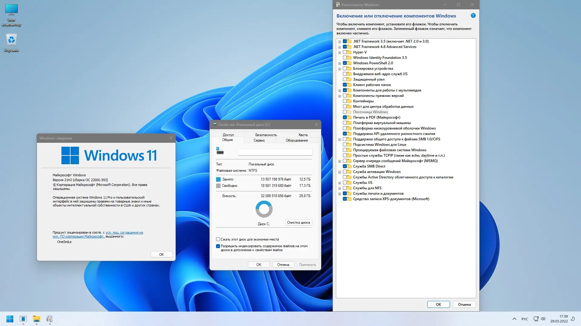 После установки система готова к использованию без дополнительных настроек. Меню «Пуск» расположено слева, как в классических версиях window, что упрощает навигацию. Поиск в системе работает, но значок скрыт для чистоты интерфейса. Контекстное меню приведено к классическому виду, восстановлены привычные пункты вроде «Копировать в папку» и «Переместить в папку», а также добавлены команды администрирования в меню «Этот компьютер». Отключён Контроль учётных записей и службы, вызывающие тормоза — WSearch, SysMain, ReadyBoot. Windows Photoviewer возвращён по умолчанию, что удобно при просмотре изображений. Шрифт системы заменён на Segoe UI SEMIBOLD, что делает текст более читаемым и визуально привлекательным. Автоматическая установка драйверов через Центр обновлений отключена, но драйвера по-прежнему можно устанавливать вручную. История файлов и папок не сохраняется, что дополнительно защищает приватность. Также удалены все лишние пункты из контекстного меню, мешающие работе. Для совместимости установлен .NET Framework 3.5 и архиватор 7, что позволяет запускать старые приложения и работать с архивами любого формата.