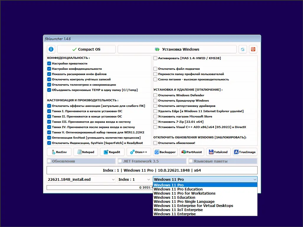 - Улучшенная конфиденциальность: отключены службы сбора данных, телеметрия, реклама и индивидуальные рекомендации.