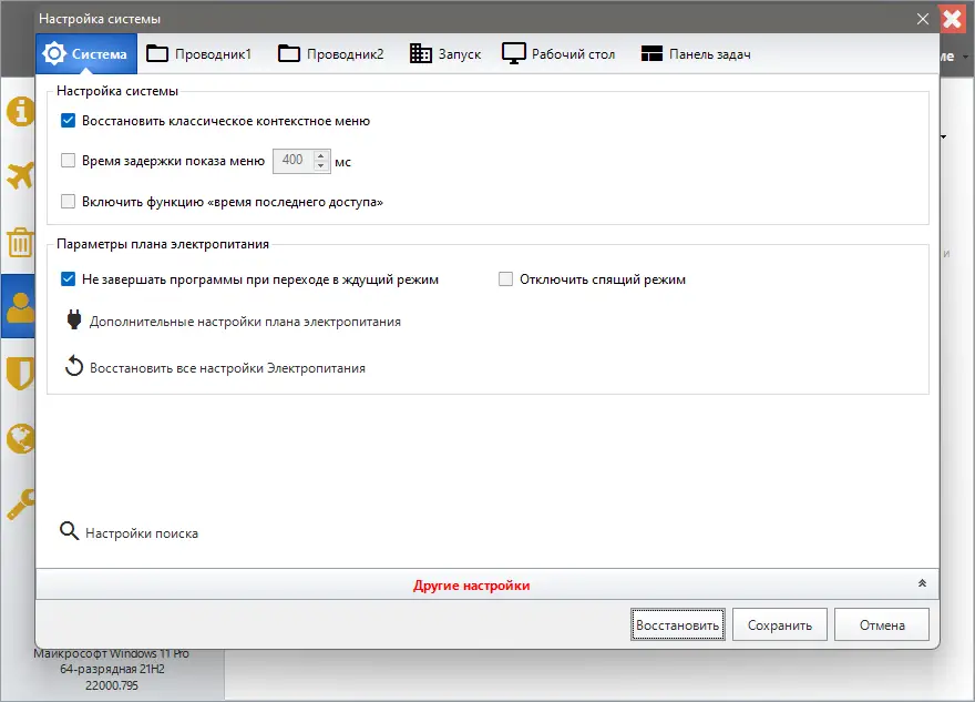 - Даёт возможность тонко настраивать интерфейс системы: Проводник, Пуск, панель задач и контекстные меню.