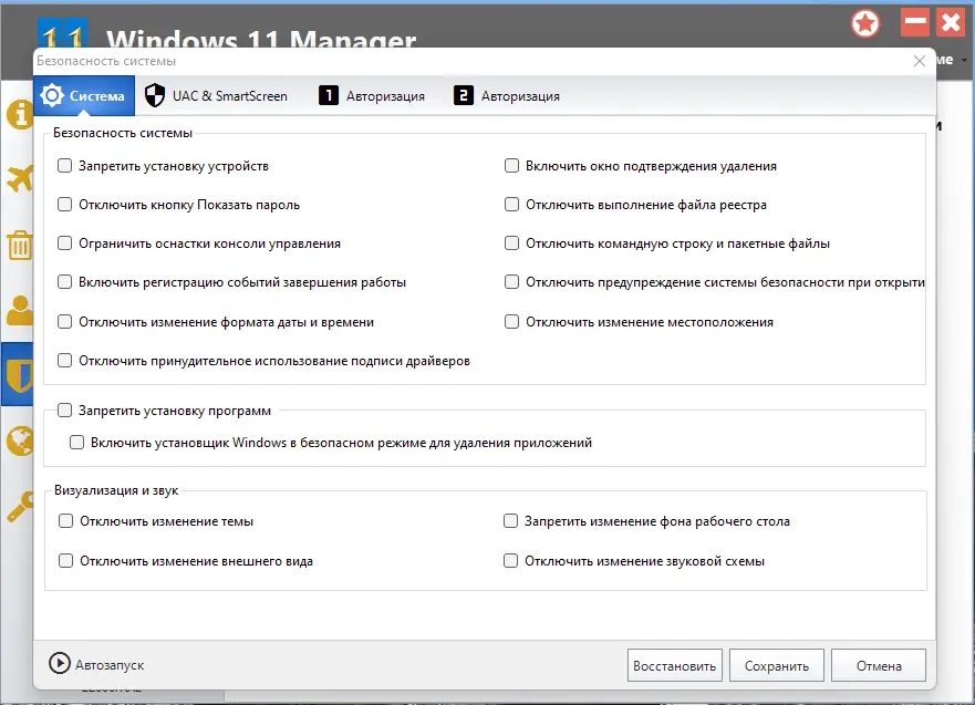 - Инструменты диагностики и восстановления системы, включая создание точек восстановления и анализ оборудования.
