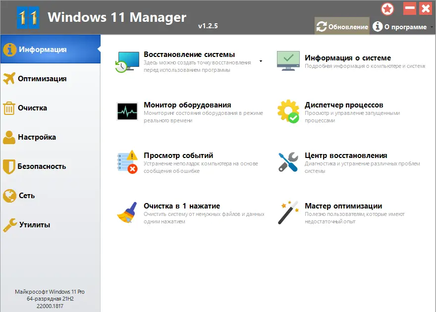 Windows 11 Manager — это комплексная утилита для тонкой настройки, оптимизации и обслуживания операционной системы Windows 11. Программа объединяет более сорока инструментов, позволяющих ускорить работу системы, очистить реестр, управлять автозагрузкой, повысить безопасность и персонализировать внешний вид интерфейса. Благодаря интуитивному интерфейсу и широкому функционалу, решение подходит как новичкам, так и опытным пользователям.