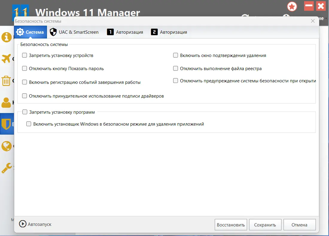 - Позволяет вручную создавать точки восстановления для защиты системы перед внесением критических изменений.