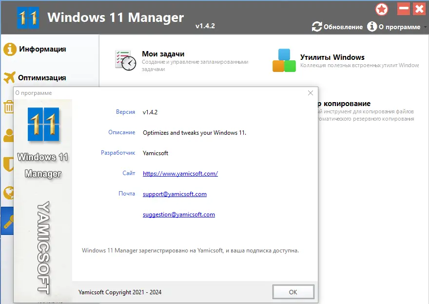 Windows 11 Manager — это комплексная утилита для настройки, оптимизации и обслуживания операционной системы Windows 11. Программа объединяет более сорока инструментов, направленных на повышение производительности, устранение ошибок, очистку системы и персонализацию интерфейса. С её помощью можно легко ускорить работу компьютера, улучшить стабильность и безопасность, а также настроить систему под индивидуальные потребности пользователя.
