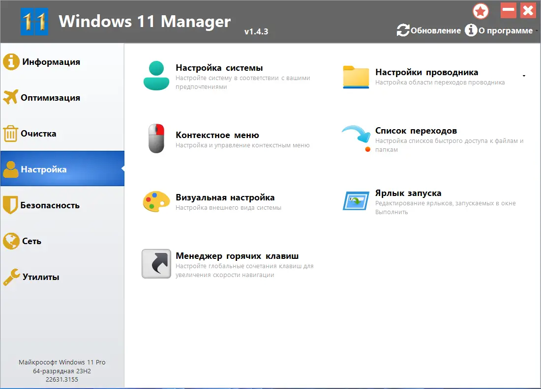 Windows 11 Manager объединяет в одном интерфейсе всё необходимое для полного контроля над системой.