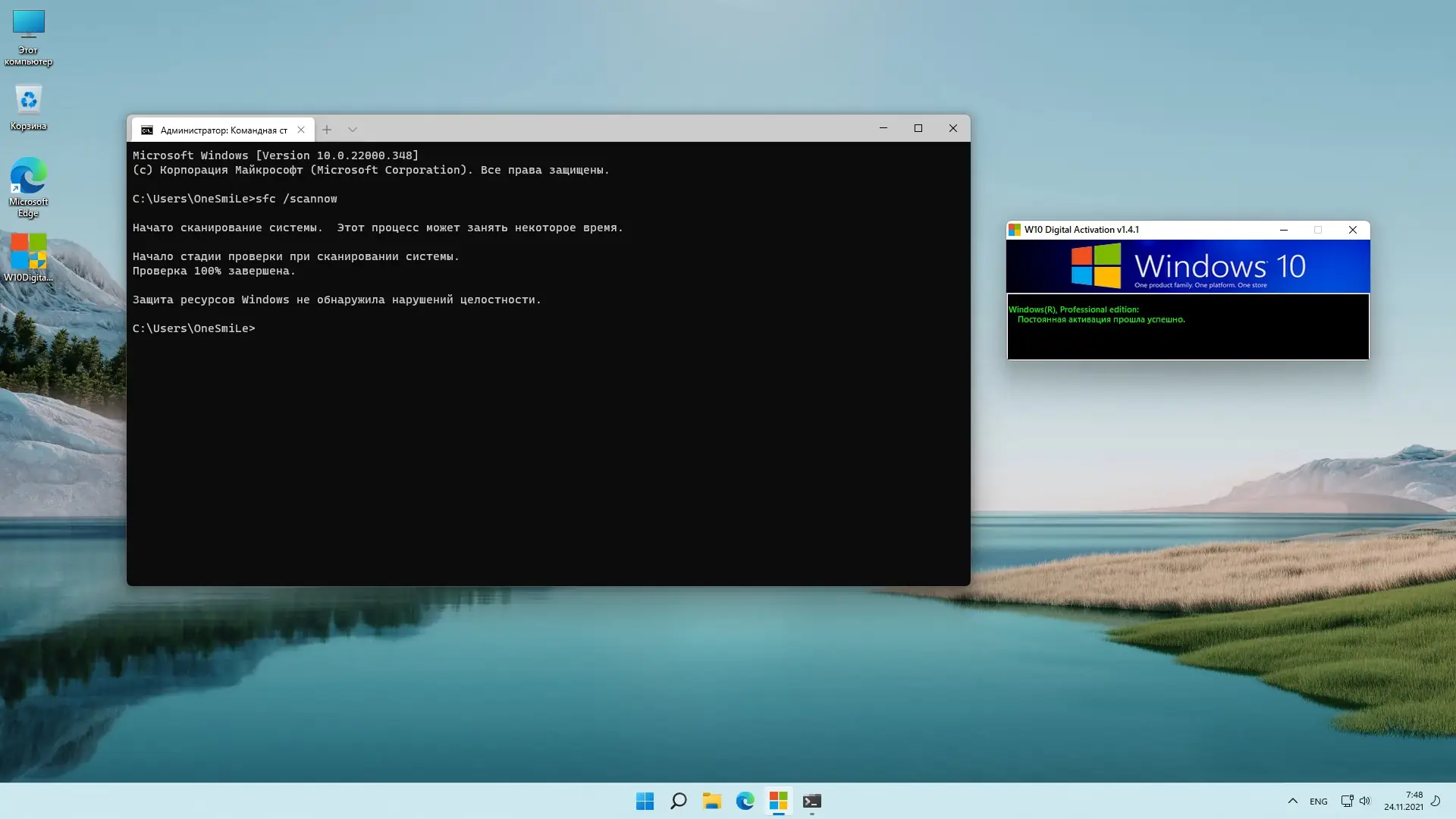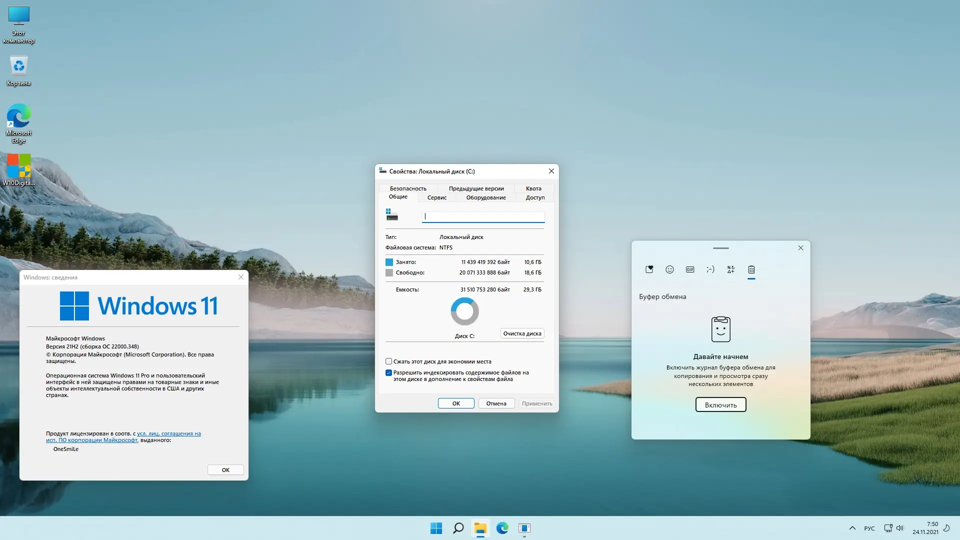 После установки доступны дополнительные инструменты и настройки, упрощающие администрирование и повседневное использование. На рабочем столе размещена утилита W10DigitalActivation, отвечающая за активацию системы. Контрольные суммы (CRC32, MD5, SHA-1) позволяют проверить целостность образа перед установкой. В состав включён архиватор 7-Zip для работы с различными форматами файлов. Удалены компоненты, не несущие функциональной нагрузки: OneDrive, SmartScreen, StepsRecorder, QuickAssist и другие. Также исключены драйверы и службы, связанные с распознаванием математических формул и биометрической аутентификацией через камеру. Внесён ряд твиков: восстановлено классическое контекстное меню, отключено зарезервированное хранилище, деактивированы исправления для уязвимостей Meltdown и Spectre, что может повысить производительность на некоторых конфигурациях. Отключён ContentDeliveryManager, отвечающий за рекламные предложения. Шрифт интерфейса заменён на Segoe UI SEMIBOLD для улучшения читаемости. Система использует актуальную версию .NET Framework вместо устаревшей 3.5. Пользовательские папки скрыты из проводника, автоматическая установка драйверов отключена, а просмотр изображений осуществляется через классический Windows Photo Viewer. Добавлены полезные команды в контекстные меню, включая копирование и перемещение файлов, а также быстрый доступ к инструментам администрирования. GameDVR отключён для снижения нагрузки на видеоподсистему.