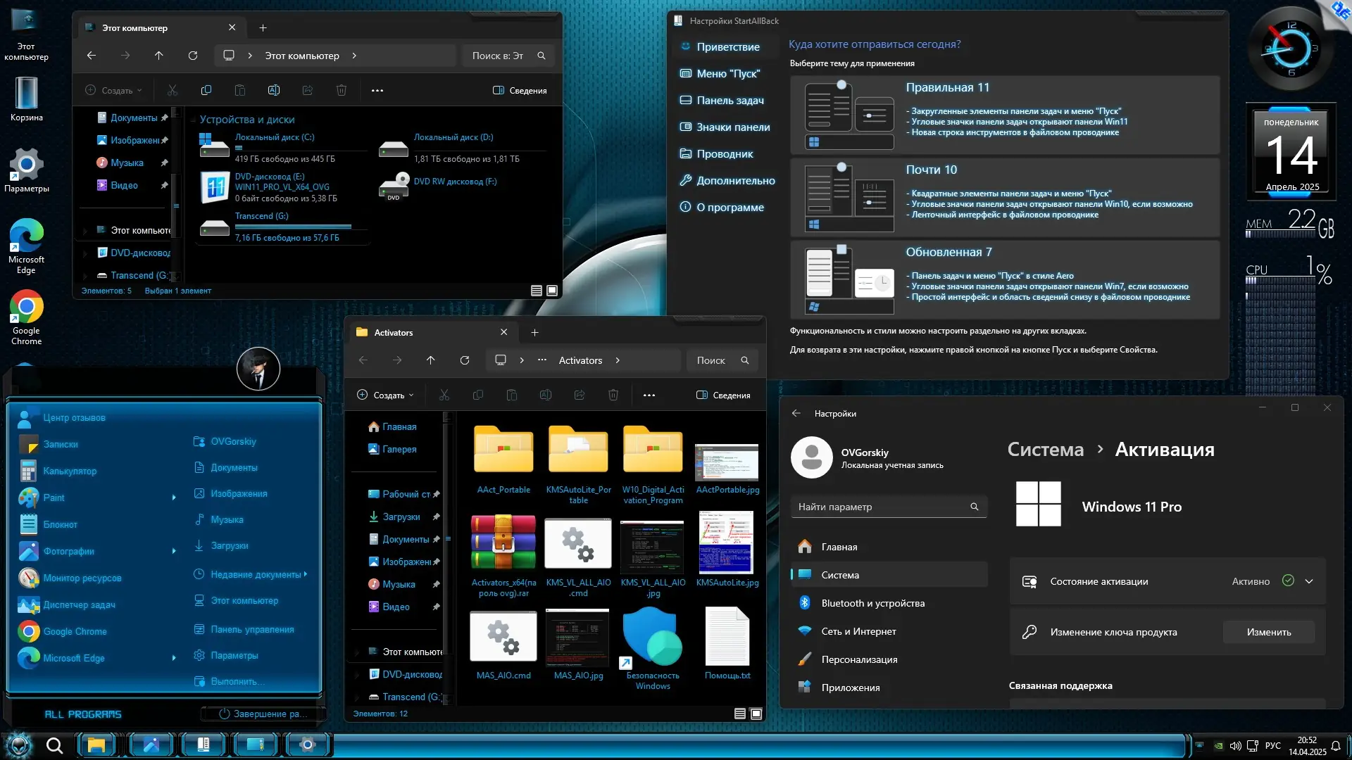 - Включены инструменты для персонализации интерфейса: StartAllBack, UltraUXThemePatcher, GadgetPack и дополнительные темы.