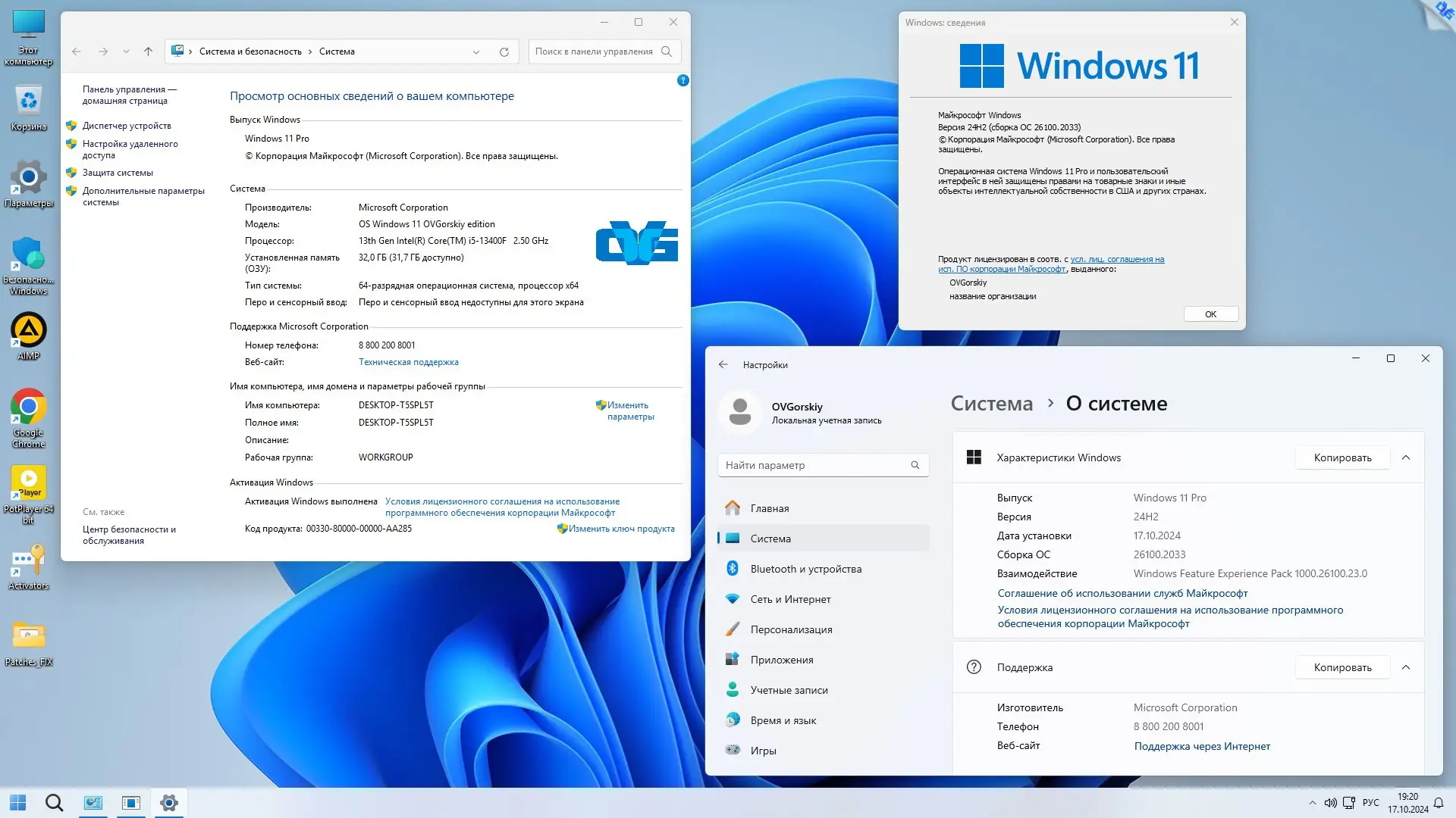 После установки система готова к использованию без дополнительной настройки. Локальная учётная запись создаётся автоматически, что ускоряет процесс входа и избавляет от необходимости подключения к интернету. Пользователь получает доступ к классическому меню «Пуск» через StartAllBack, что делает интерфейс более привычным. Все дополнительные программы устанавливаются автоматически после первого запуска. Управление системой упрощено: в контекстное меню рабочего стола добавлены пункты «Персонализация+» и «Панель настроек», а в проводнике — быстрые действия для копирования, перемещения и открытия файлов в блокноте. Для активации используется встроенный KMS-активатор или собственный лицензионный ключ. Антивирусные функции отключены на этапе установки, но могут быть включены вручную через папку Patches_FIX на рабочем столе.
