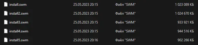 - Файл install.wim разбит на части для совместимости с FAT32, что позволяет записывать образ на флеш-накопители без необходимости использовать exFAT или NTFS.