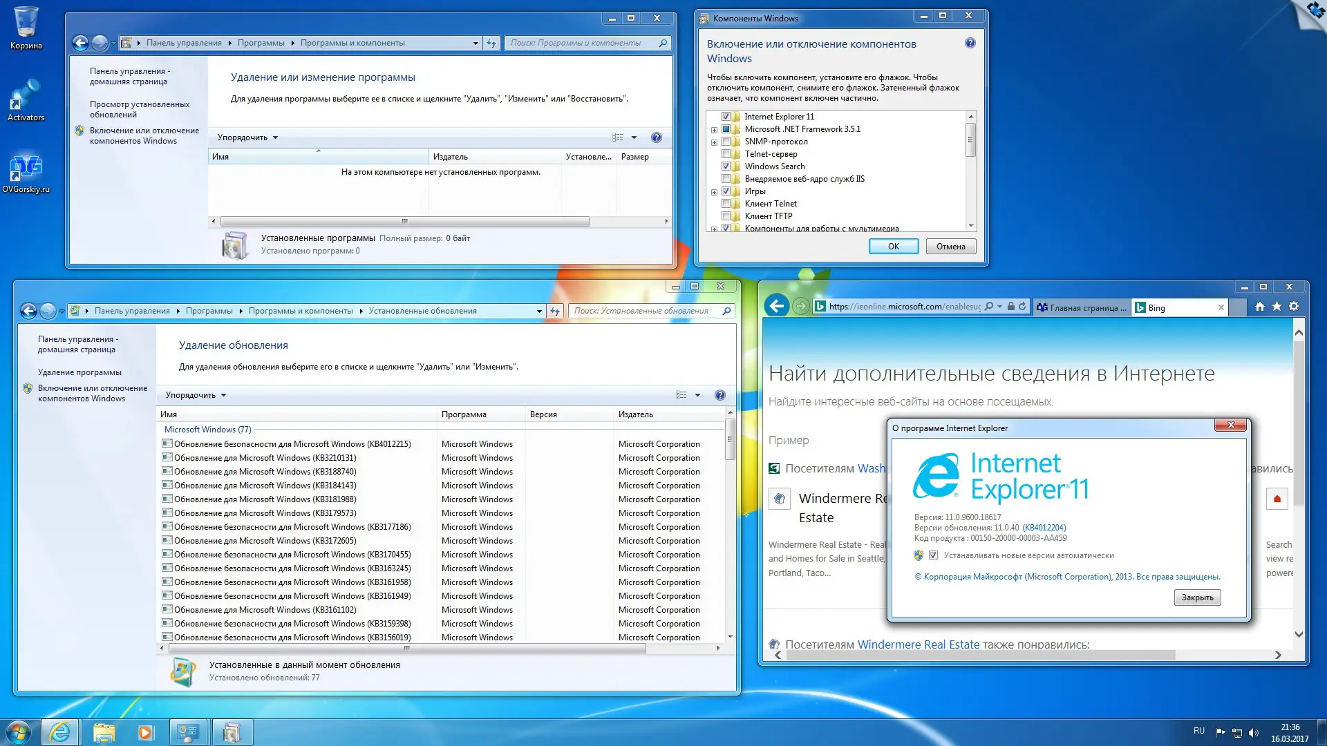 После установки система готова к использованию: на рабочем столе уже находятся значки «Мой компьютер», «Панель управления» и Internet Explorer 11, а в меню «Пуск» добавлен пункт «Выполнить». Пользователю не нужно вручную настраивать отображение расширений файлов или скрытых папок — всё это включено по умолчанию. В состав входят такие приложения, как WinRAR, Adobe Reader, Java, .NET Framework 4.6.2 и другие, что позволяет сразу работать с архивами, документами и веб-контентом. Для первоначальной настройки подключений доступна программа SDI для установки драйверов сетевых и USB-устройств. При необходимости можно быстро вернуться к исходному виду системы, удалив пакет оформления через «Программы и компоненты».