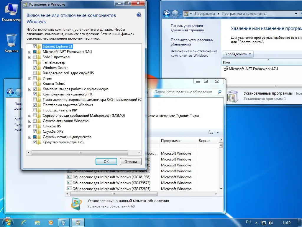 - Удалены ненужные и ресурсозатратные элементы: Медиа центр, DVD Мейкер, Защитник Windows, Hyper-V