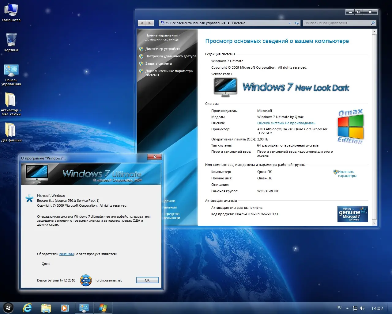 - Применён тематический пакет оформления Windows 7 New Look Dark, придающий системе строгий и современный вид.
