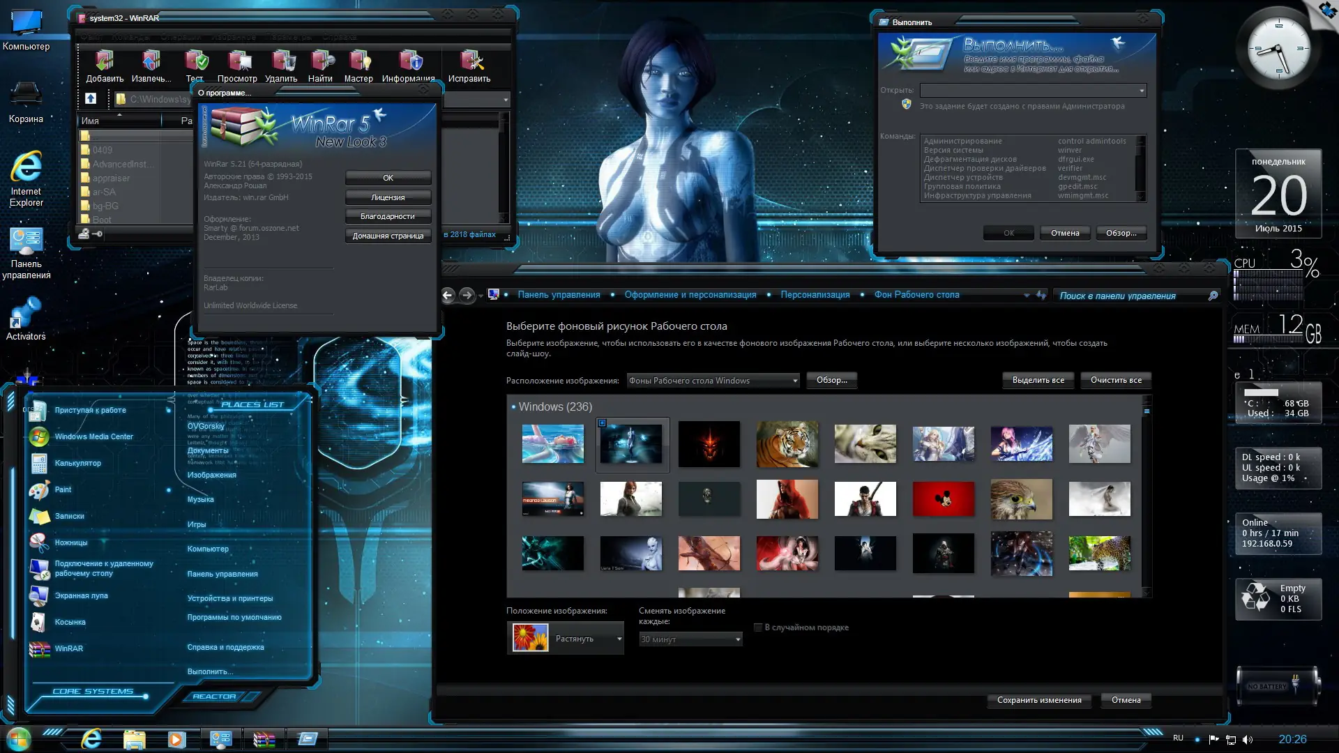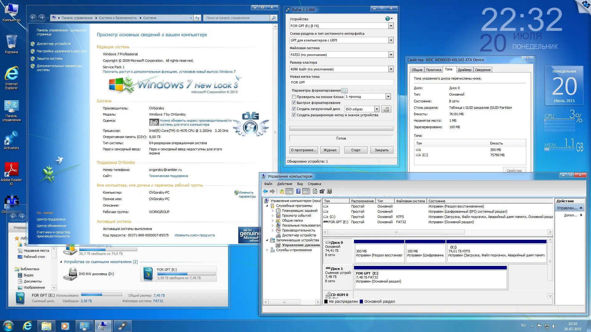 После установки система предлагает уже настроенное окружение: на рабочем столе отображаются значки «Мой компьютер», «Панель управления» и «Internet Explorer 11», в меню «Пуск» добавлена команда «Выполнить», а также расширены контекстные меню файлов и папок. Показываются скрытые элементы и расширения файлов, что удобно для продвинутых пользователей. По умолчанию в IE11 изменён поисковик на Google, добавлены новые темы оформления, заставки, гаджеты и фоновые изображения. Отключён UAC, чтобы избежать частых запросов на подтверждение. Все изменения выполнены стандартными средствами Windows AIK, что гарантирует безопасность и совместимость. Установка возможна как с DVD, так и с USB-носителя, при этом для UEFI-систем требуется использование Rufus с настройкой FAT32 и GPT.