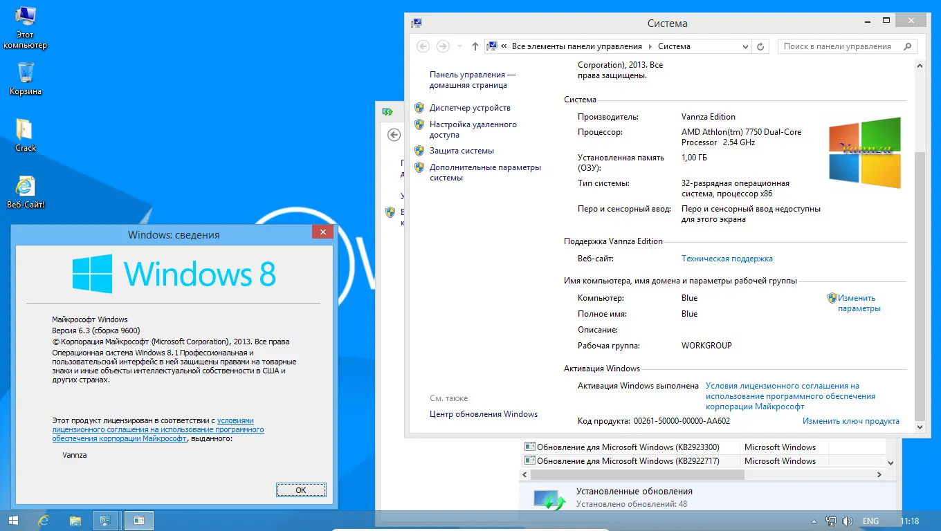 Сборка Vannza — это глубоко оптимизированная и модифицированная версия Windows 8.1 Pro VL, основанная на оригинальных образах MSDN с интеграцией всех важных обновлений и компонентов. Установка возможна только на чистую систему, обновление с предыдущих версий отсутствует. В системе удалены ненужные службы, отключены фоновые процессы, интегрированы популярные компоненты вроде .Net Framework 3.5 и Microsoft Visual C++ 2005–2013, что обеспечивает стабильность и высокую производительность с момента первого запуска.