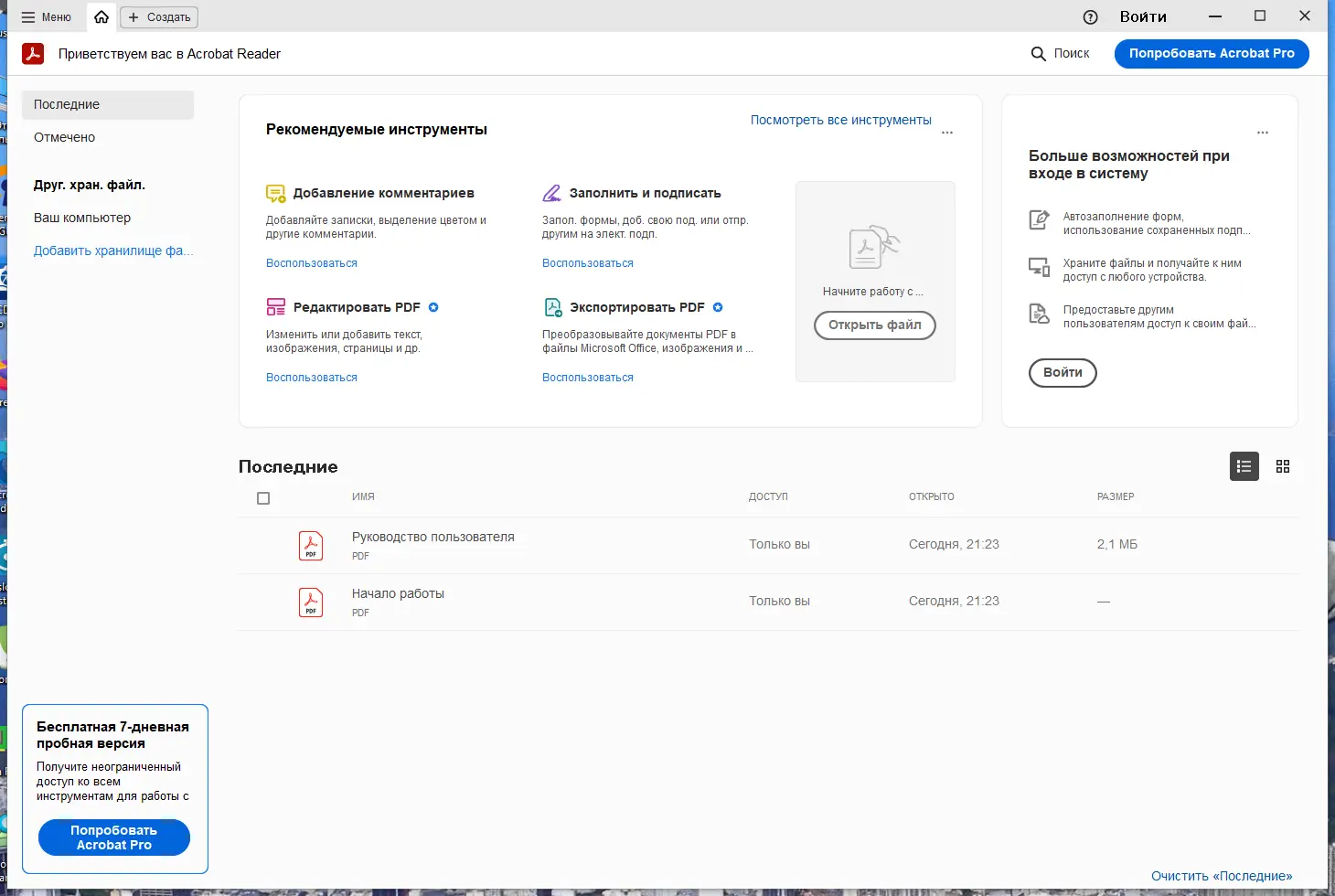 - Для использования расширенных функций, таких как конвертация в Word или добавление подписей, требуется подключение к интернету и аккаунт Adobe.