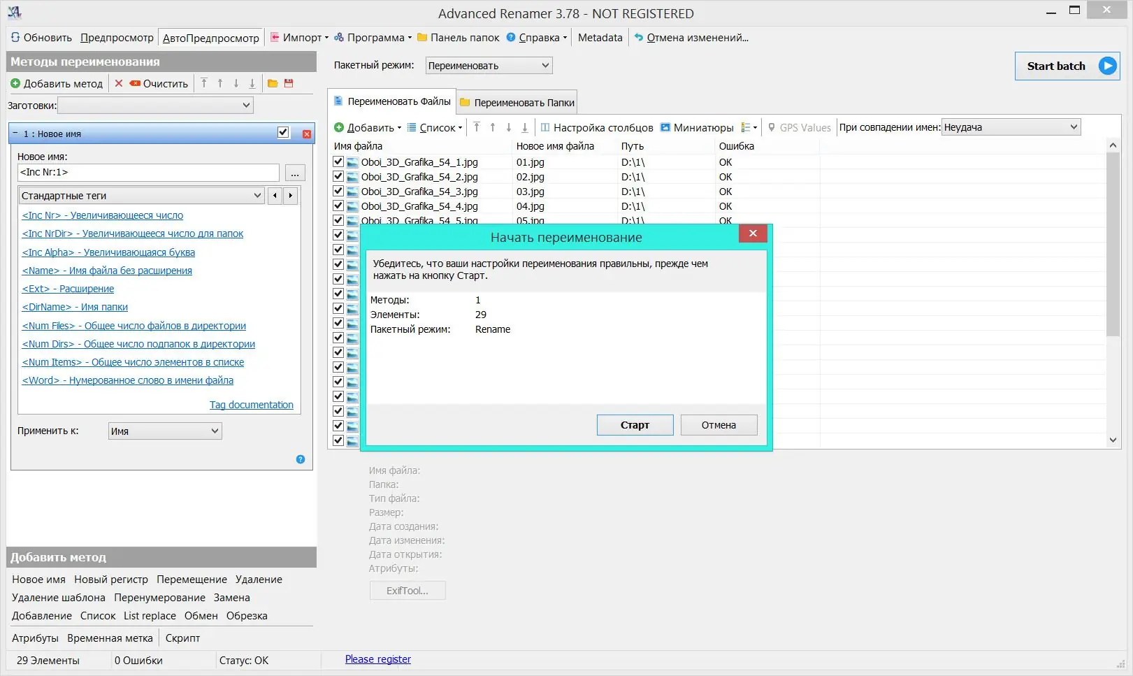 - Режим предварительного просмотра, позволяющий увидеть итоговые имена до применения изменений