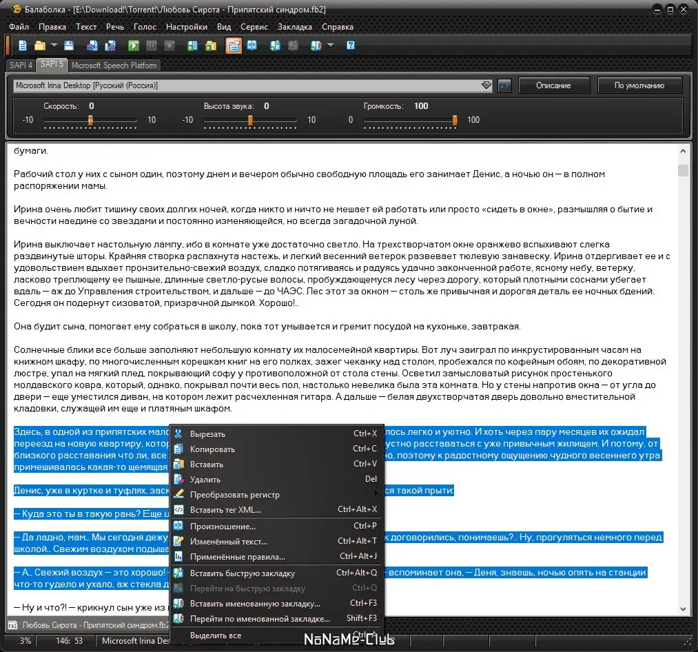В Balabolka реализована функция преобразования текста в речь с поддержкой различных синтезаторов, что делает её универсальным инструментом для озвучки документов, электронных книг и буфера обмена. Программа поддерживает широкий спектр форматов, позволяет сохранять аудиодорожки и настраивать параметры голоса. Подходит для пользователей, которым необходима качественная и гибкая система tts на русском языке.
