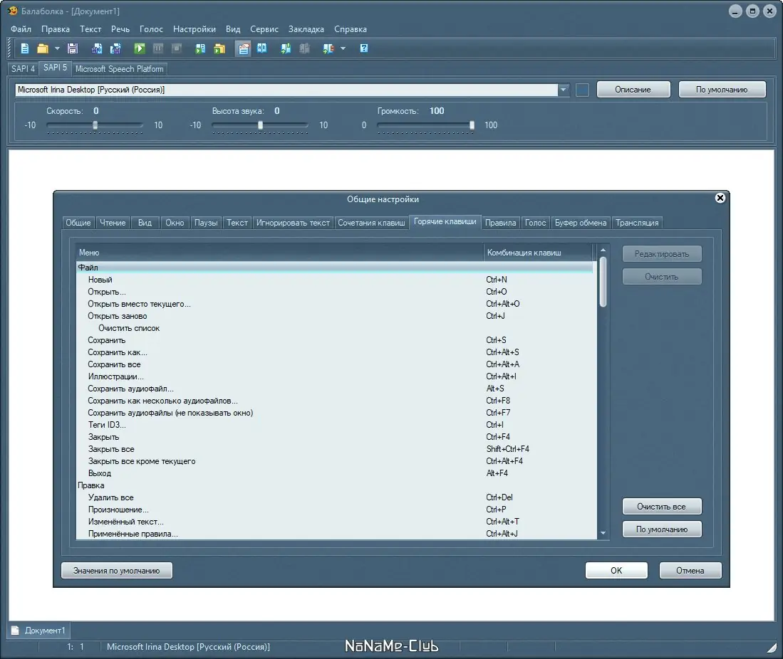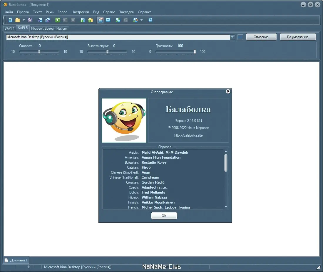 - Функция преобразования текста в речь реализована через совместимость с Microsoft Speech API, что позволяет использовать разные голоса.