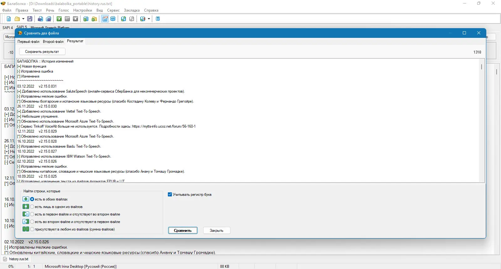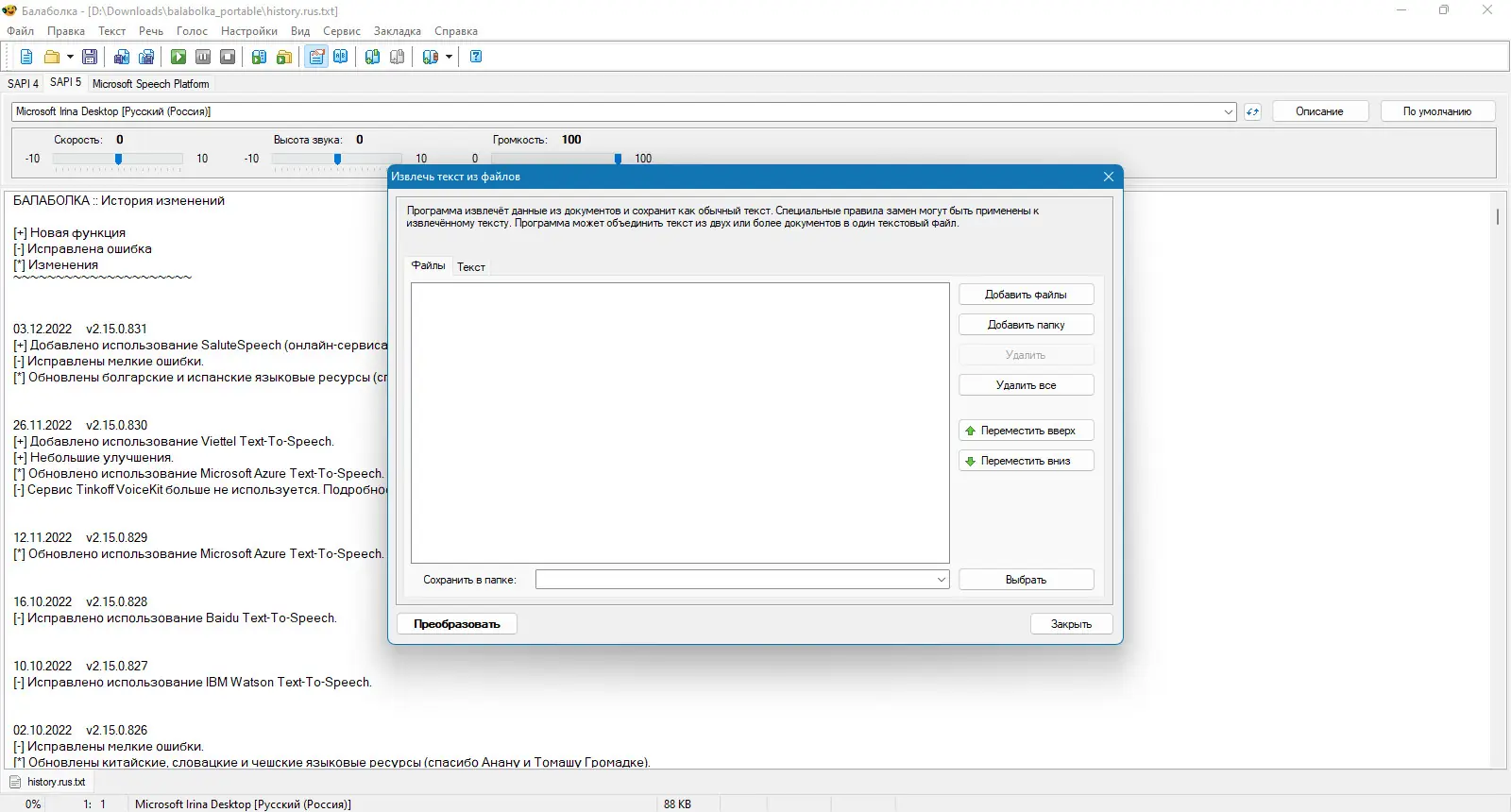 Программа Balabolka превращает текстовые файлы в аудио, озвучивая их с помощью доступных на компьютере синтезаторов речи. Поддерживает множество форматов документов и возможность сохранения озвученного текста в аудиофайлы с поддержкой тегов и субтитров.