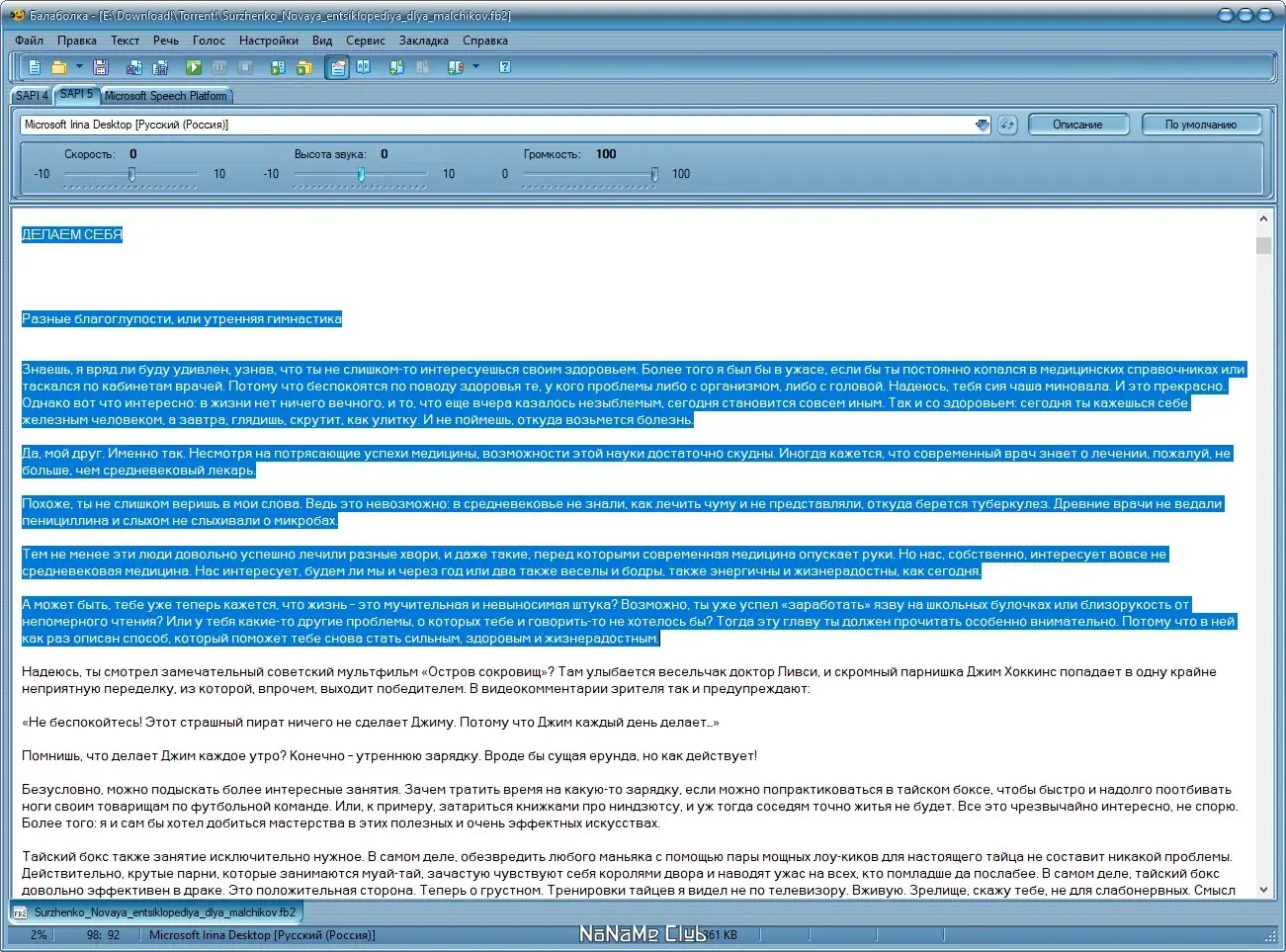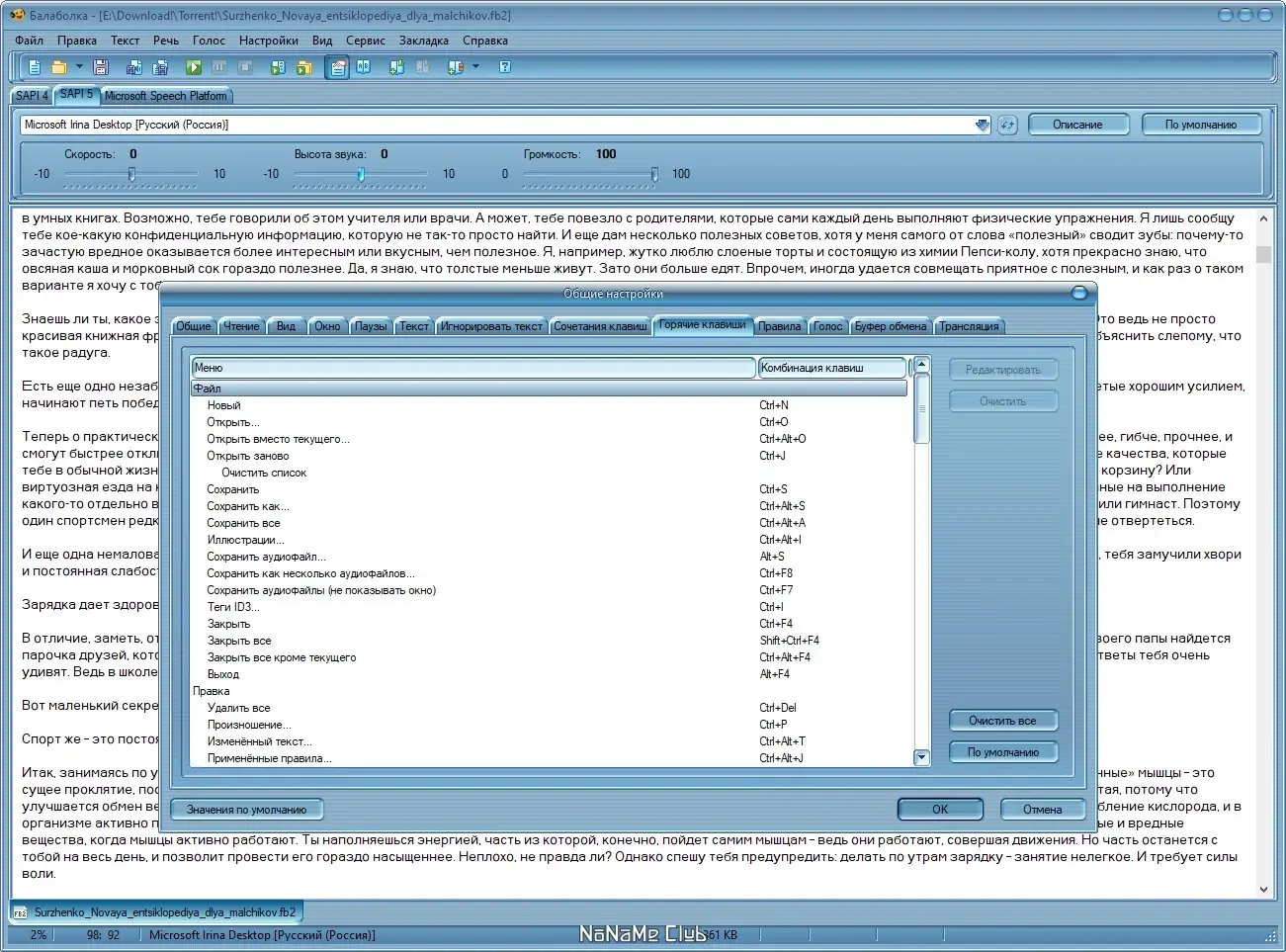 Balabolka — это текстовый ридер, преобразующий письменный текст в устную речь с помощью технологии tts. Программа поддерживает широкий спектр форматов, включая PDF, DOCX, EPUB, FB2 и другие, что делает её универсальным решением для пользователей, которым необходимо слушать тексты. Она работает на базе установленных в системе голосовых движков, включая различные версии Microsoft Speech API.