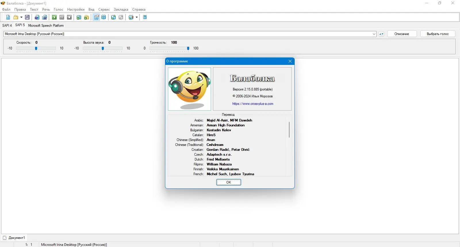 Balabolka — это мощная программа для чтения текста вслух, использующая доступные на компьютере голосовые движки. Поддерживает множество форматов документов и позволяет конвертировать текст в аудио, настраивать параметры озвучки и управлять воспроизведением с клавиатуры или из системного трея.