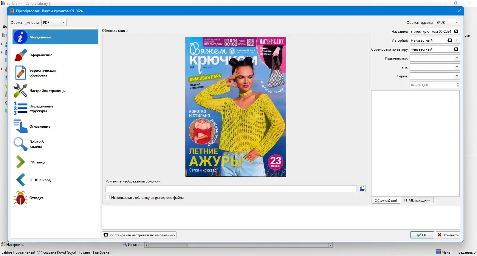 После запуска программа предлагает добавить книги в библиотеку, автоматически извлекая информацию о названии, авторе и годе издания. Пользователь может редактировать метаданные, добавлять теги, оценки и комментарии для удобной классификации. Для конвертации достаточно выбрать книгу, нажать кнопку преобразования и настроить параметры, такие как размер шрифта, тип обложки или формат выходного файла. Синхронизация с ридером происходит в один клик — Calibre определяет устройство, подбирает нужный формат и передаёт данные. Встроенная читалка поддерживает настройку интерфейса, поиск по тексту и сохранение закладок.