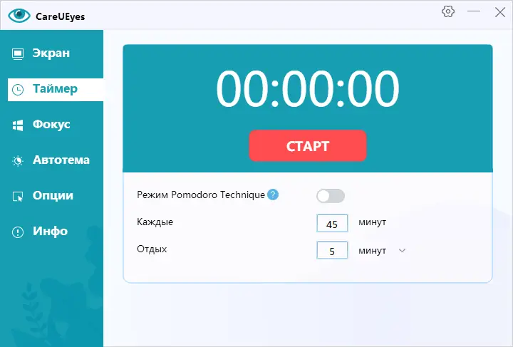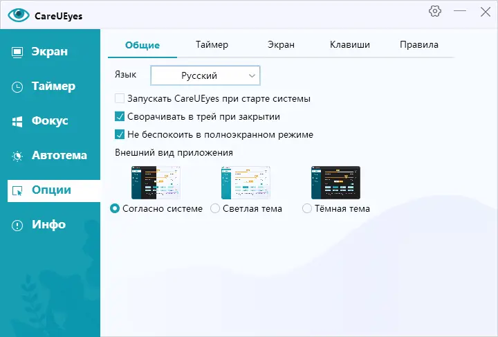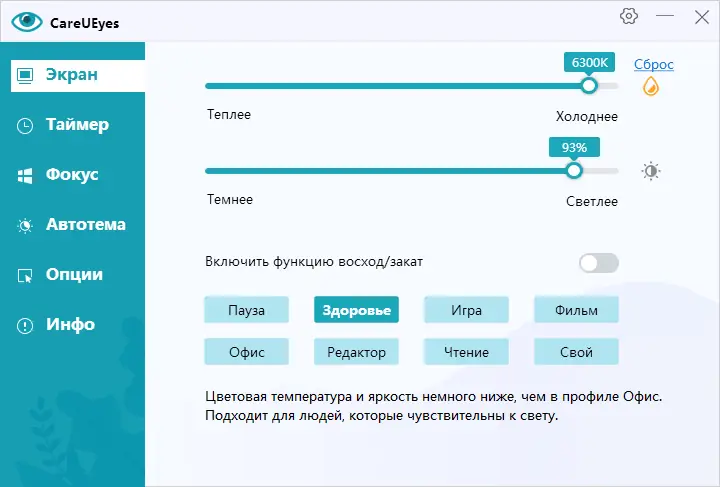 Программа CareUEyes предназначена для защиты зрения пользователей, проводящих много времени перед экраном. Она корректирует цветовой баланс, снижая долю синего света, особенно в вечернее и ночное время, что способствует уменьшению усталости глаз и улучшению качества сна. Кроме того, приложение включает встроенный таймер перерывов, который мягко напоминает оторваться от работы и дать зрению отдых.